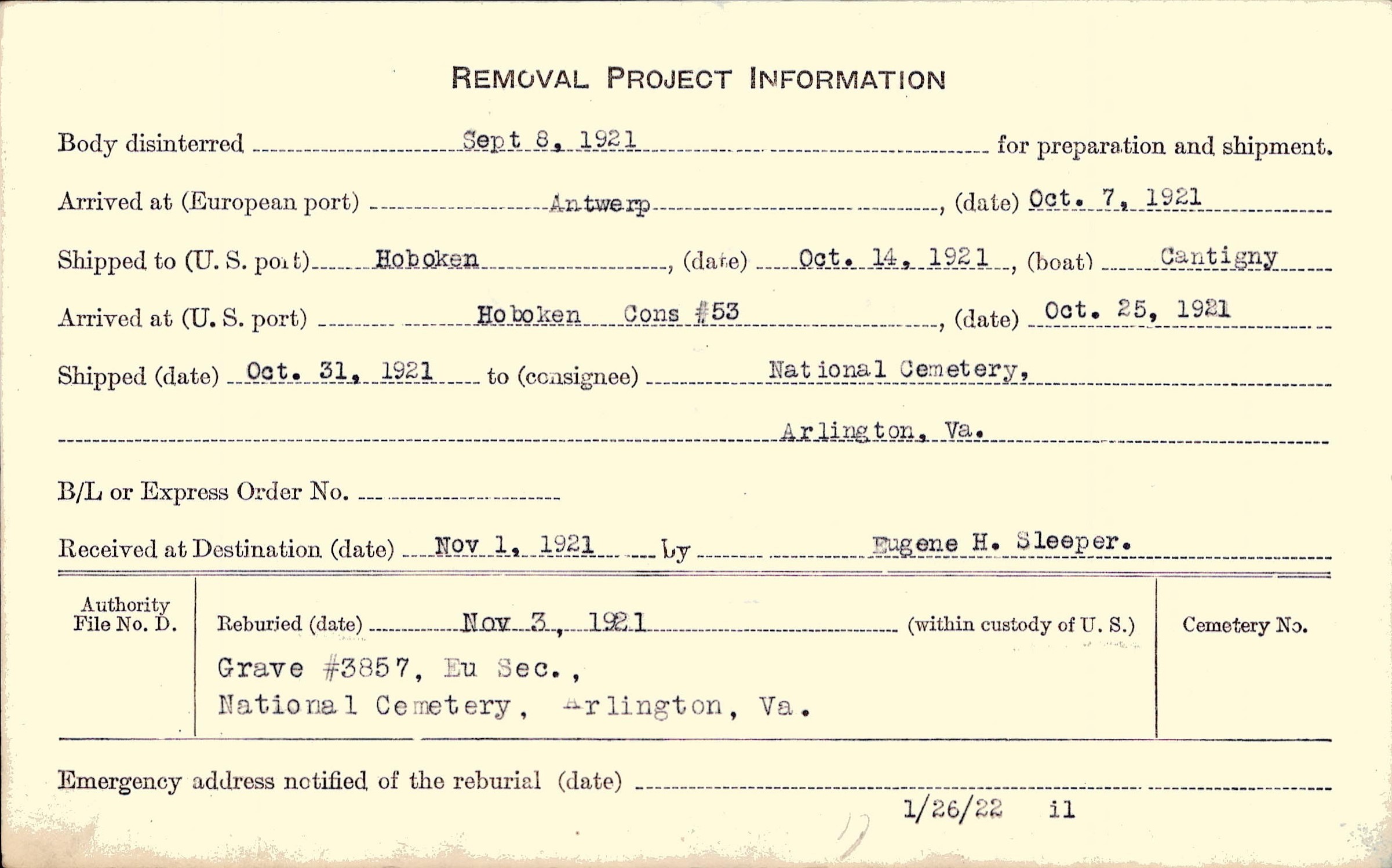 Body disinterred 9/8/1921 for preparation and shipment.