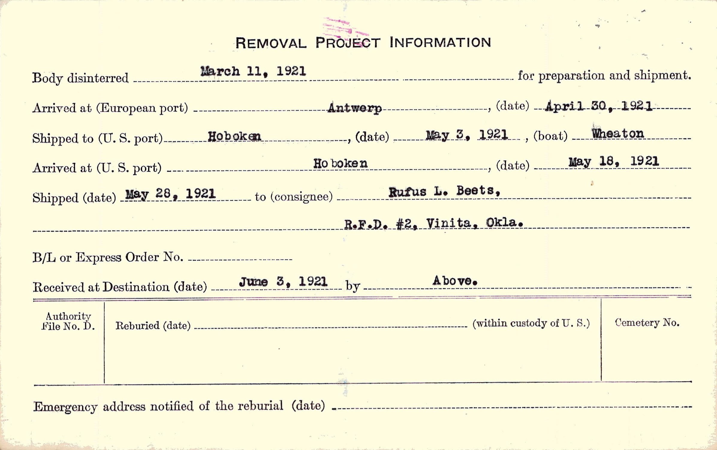 to Rufus L. Beets, R.F.D. #2, Vinita, Okla.