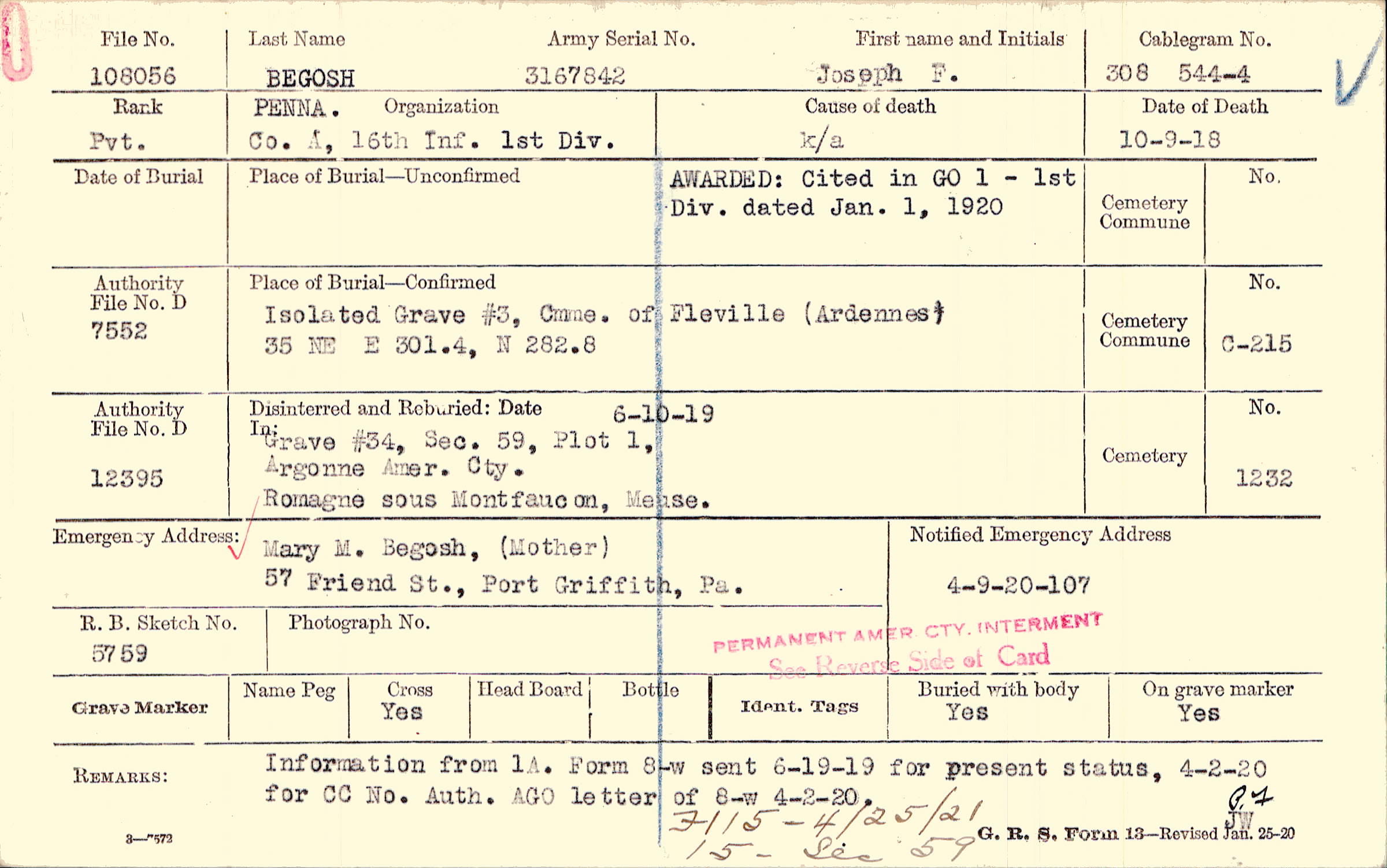 Mary M. Begosh, (Mother), 57 friend St., Port Griffith, Pa.