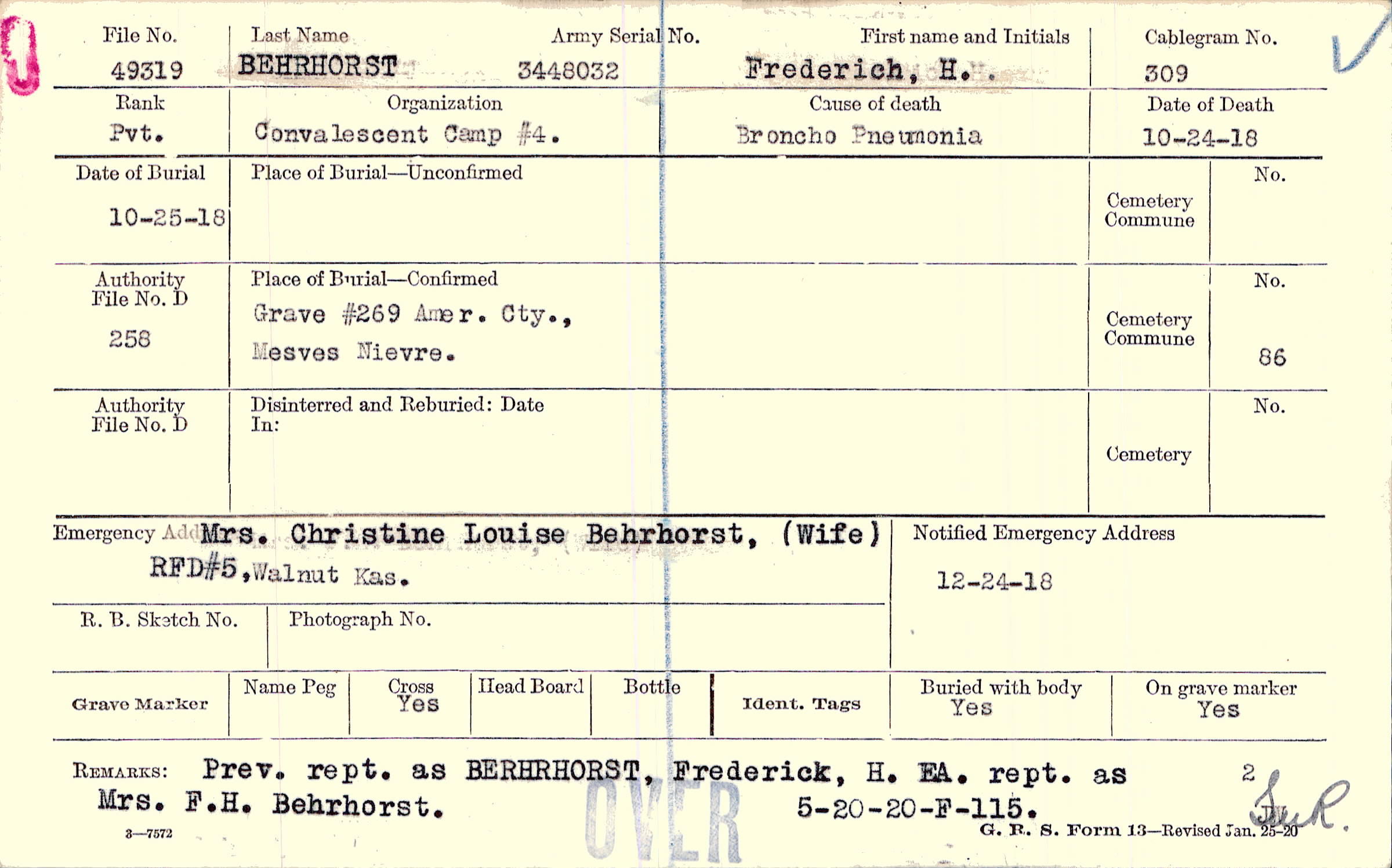 Mrs. Christine Louise Behrhorst, (Wife), RFD #5, Walnut, Kans.