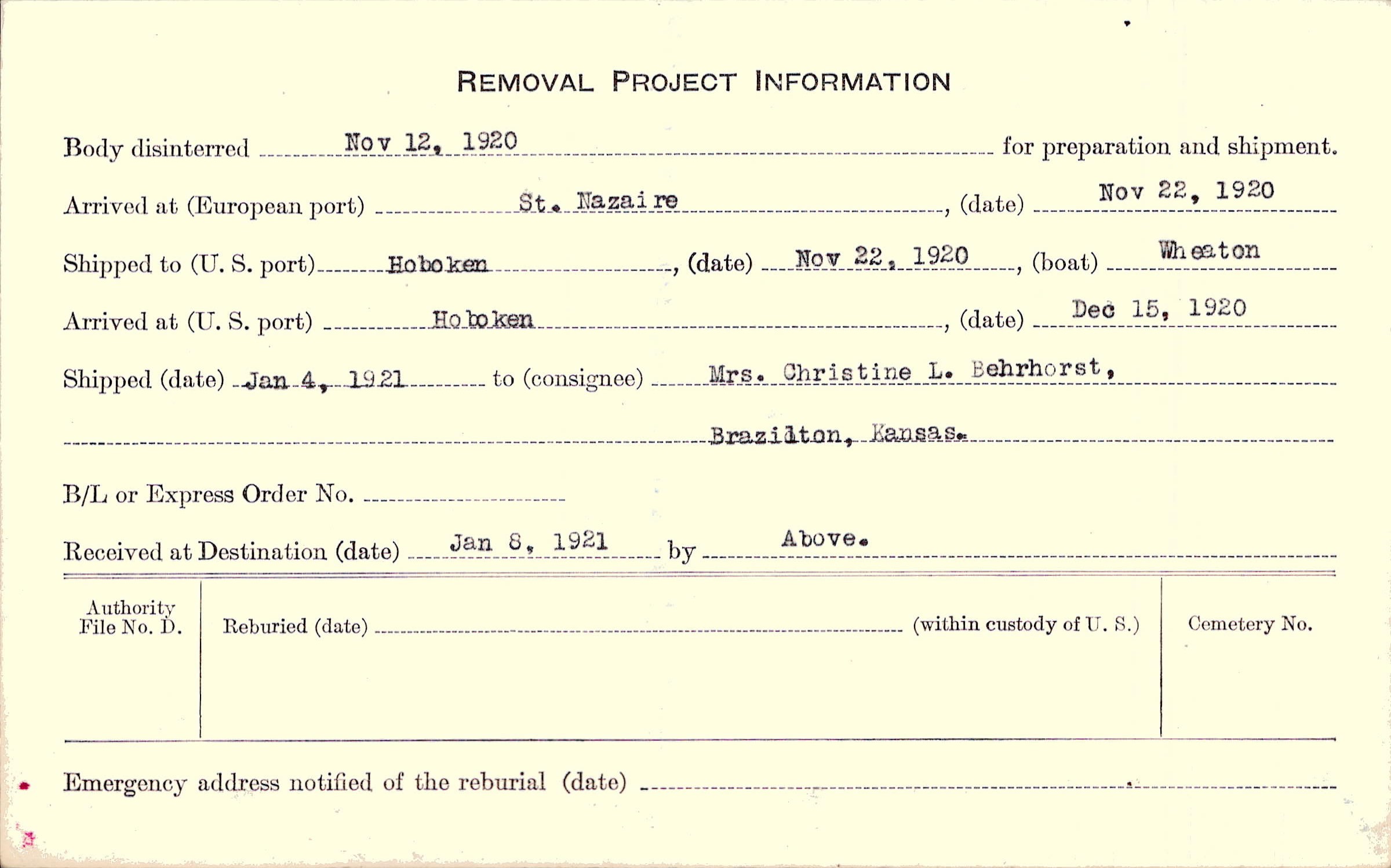 Body disinterred 11/12/1920 for preparation and shipment.