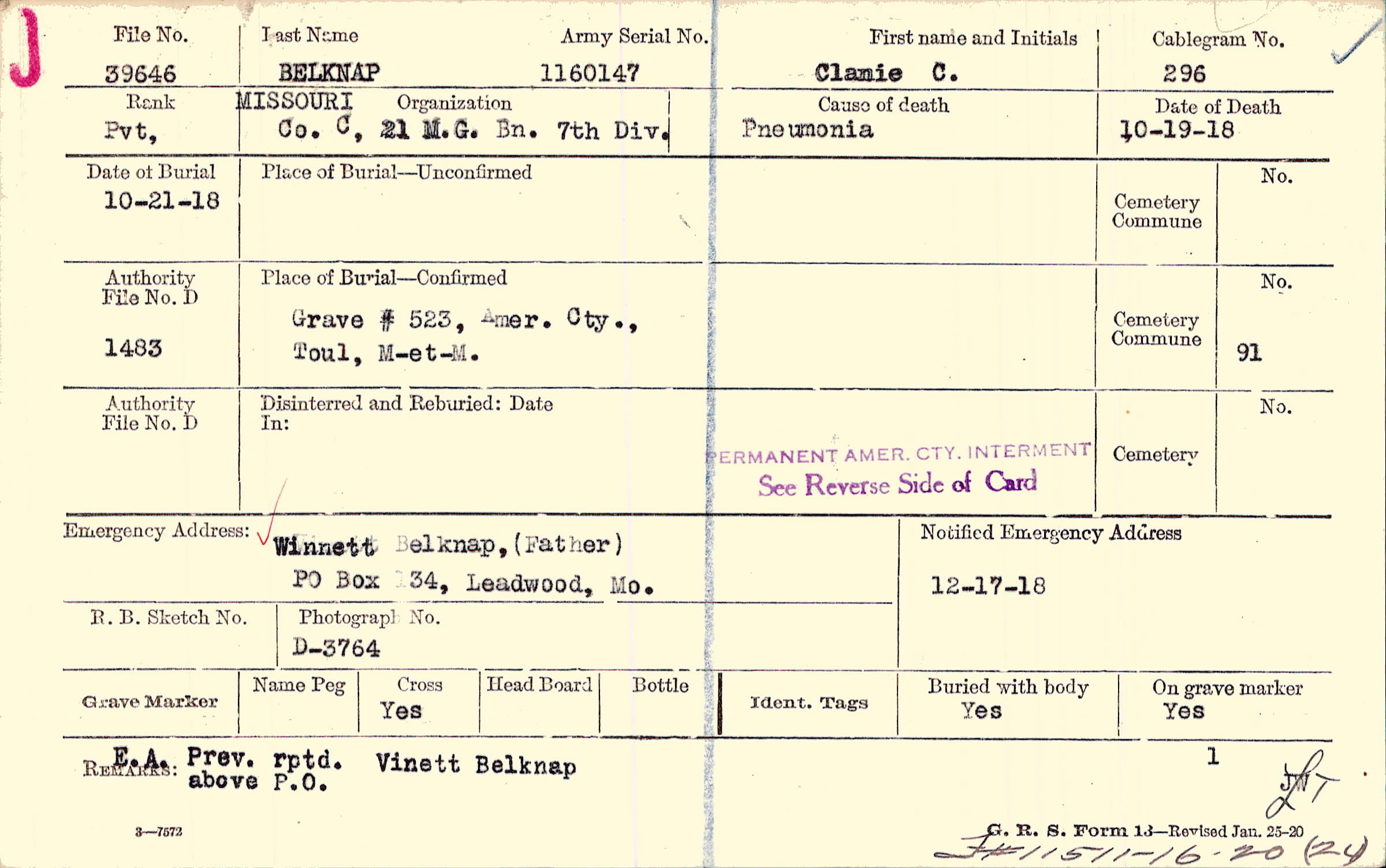 Winnett Belknap, (Father), PO Box 134, Leadwood, Mo.