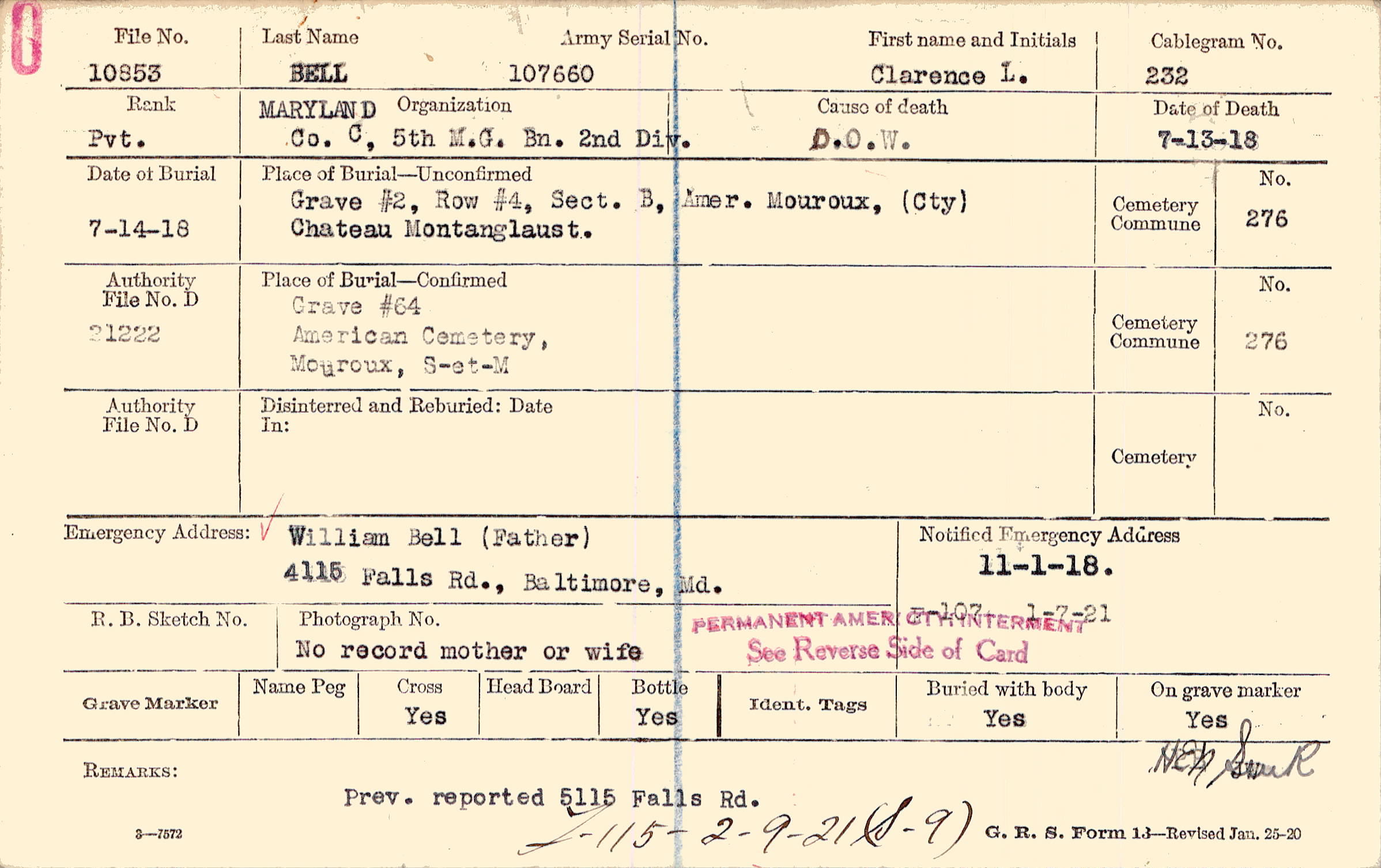 William Bell (Father), 4115 Falls Rd., Baltimore, Md., No record mother or wife