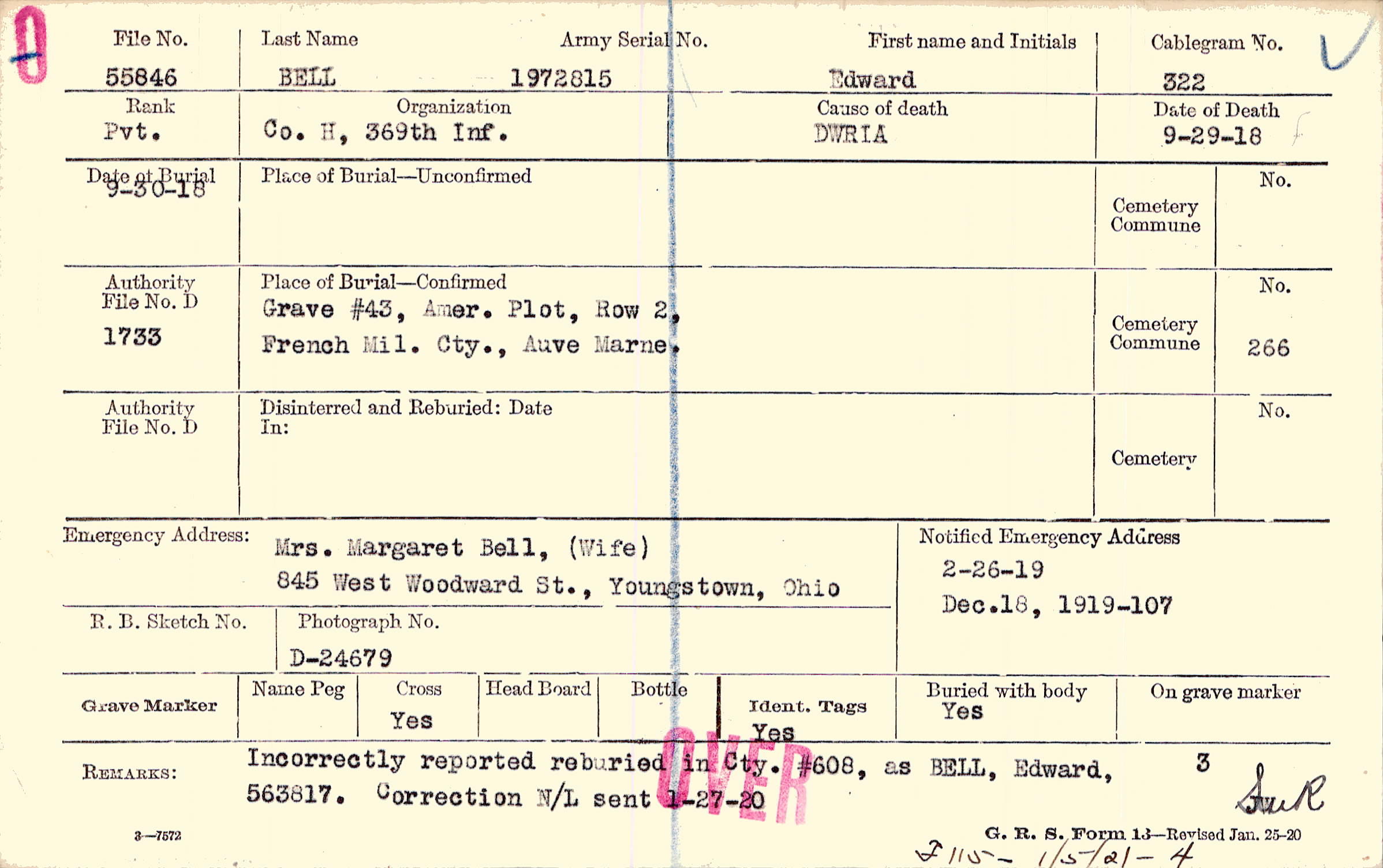 Incorrectly reported reburied in Cty. #608, as BELL, Edward, 563817. Correction N/L sent 1-27-20, F115 - 1/5/21 - 4