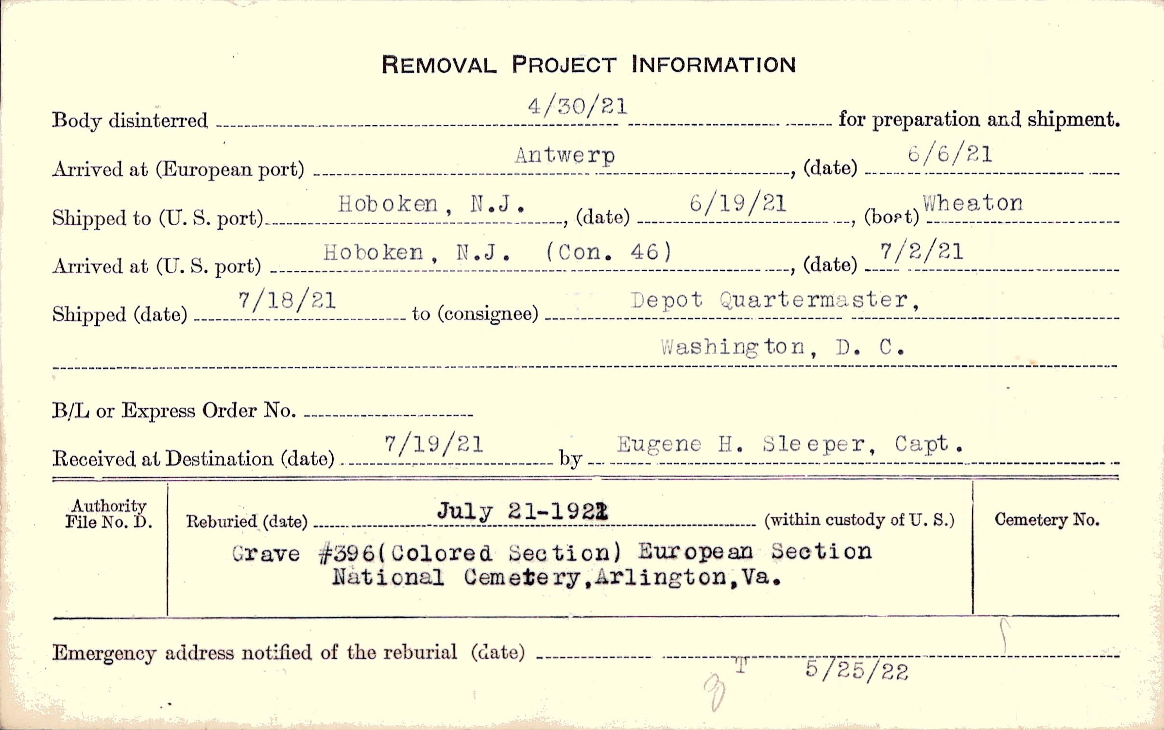 Body disinterred 4/30/1921 for preparation and shipment.