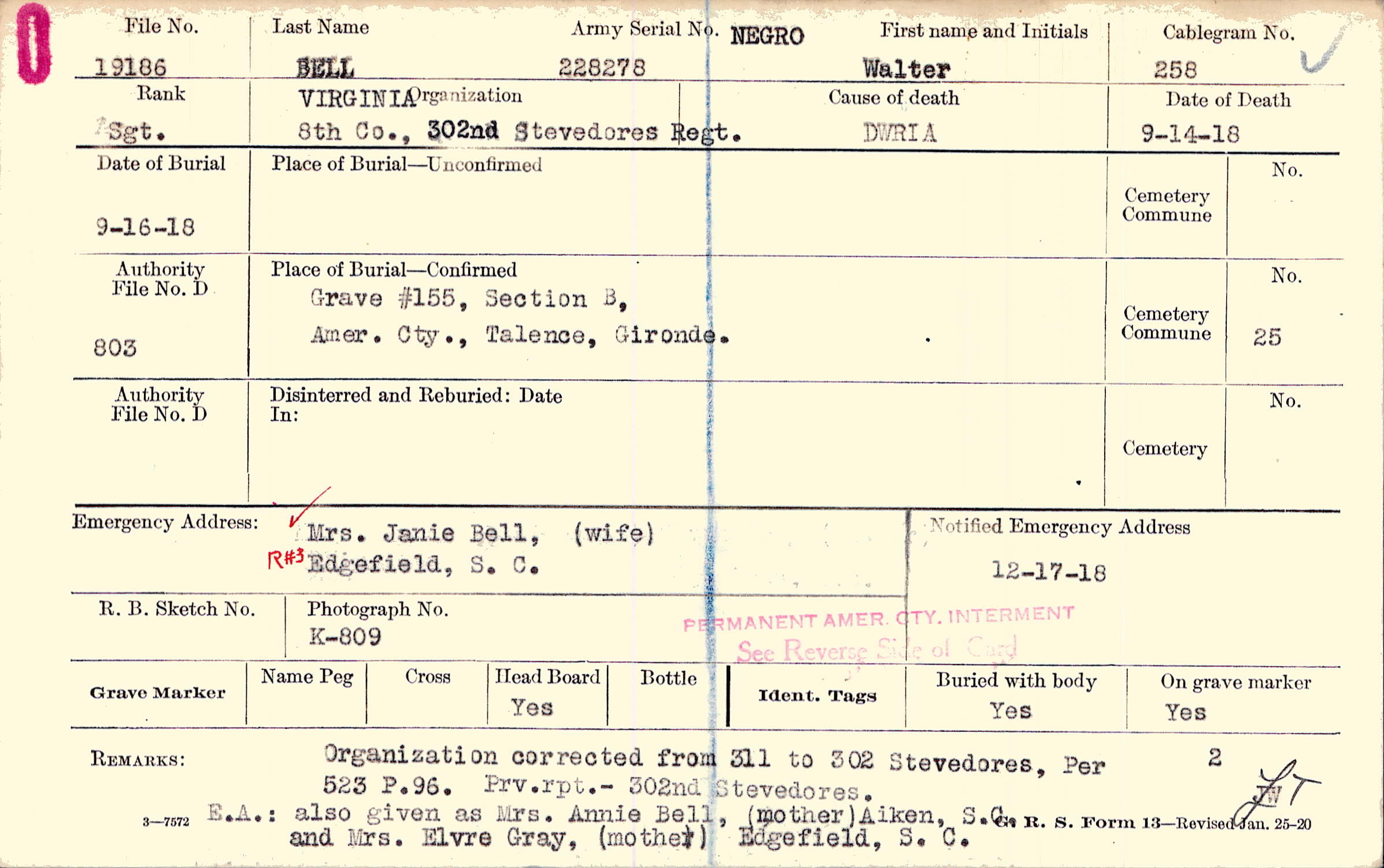 Mrs. Janie Bell, (wife), R#3 Edgefield, S.C.