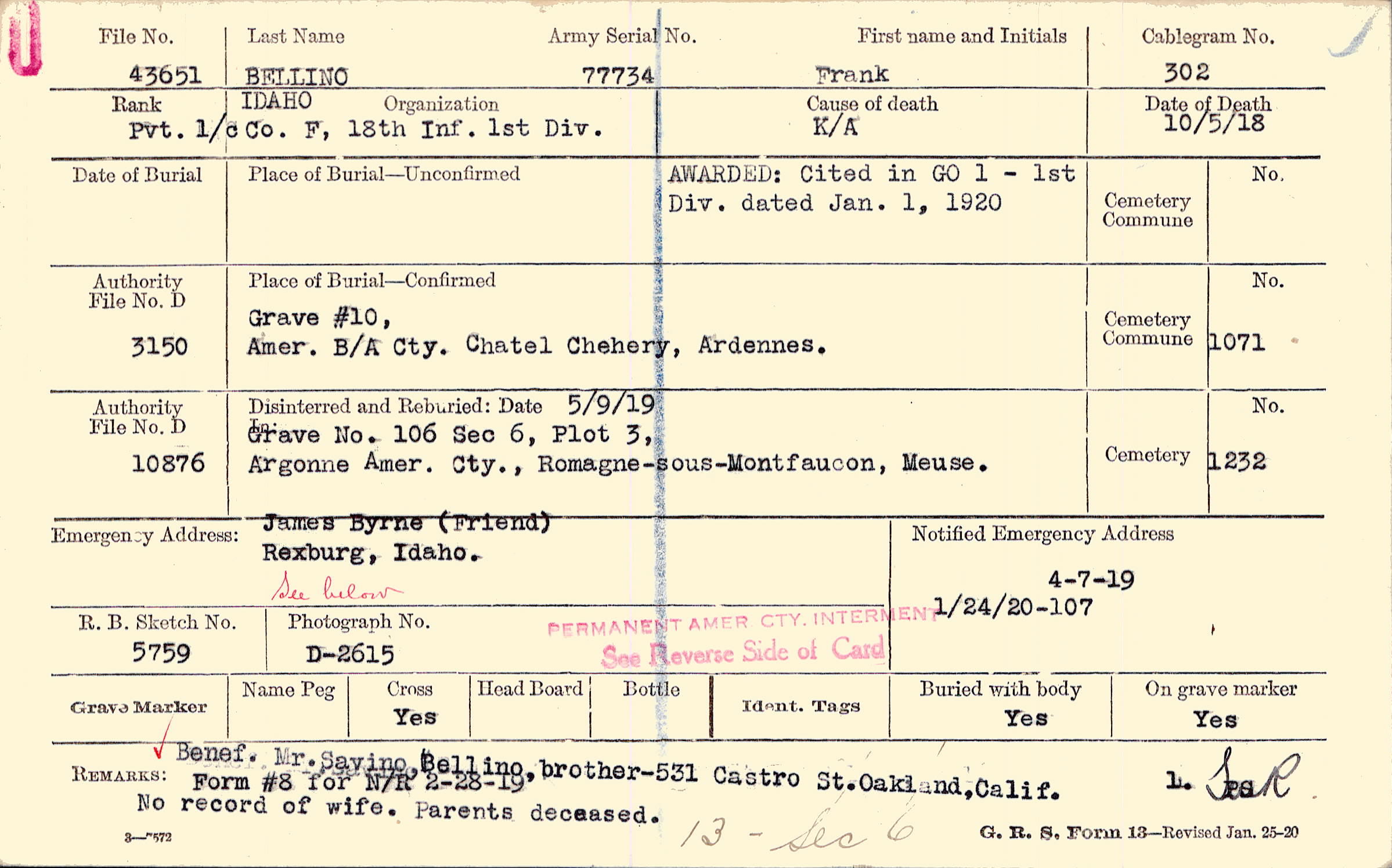 Benef. Mr. Savino Bellino, brother-531 Castro St. Oakland, Calif. No record of wife. Parents deceased, Form #8 for N/R 2-28-19, F-115 [unclear] 13-Sec 6