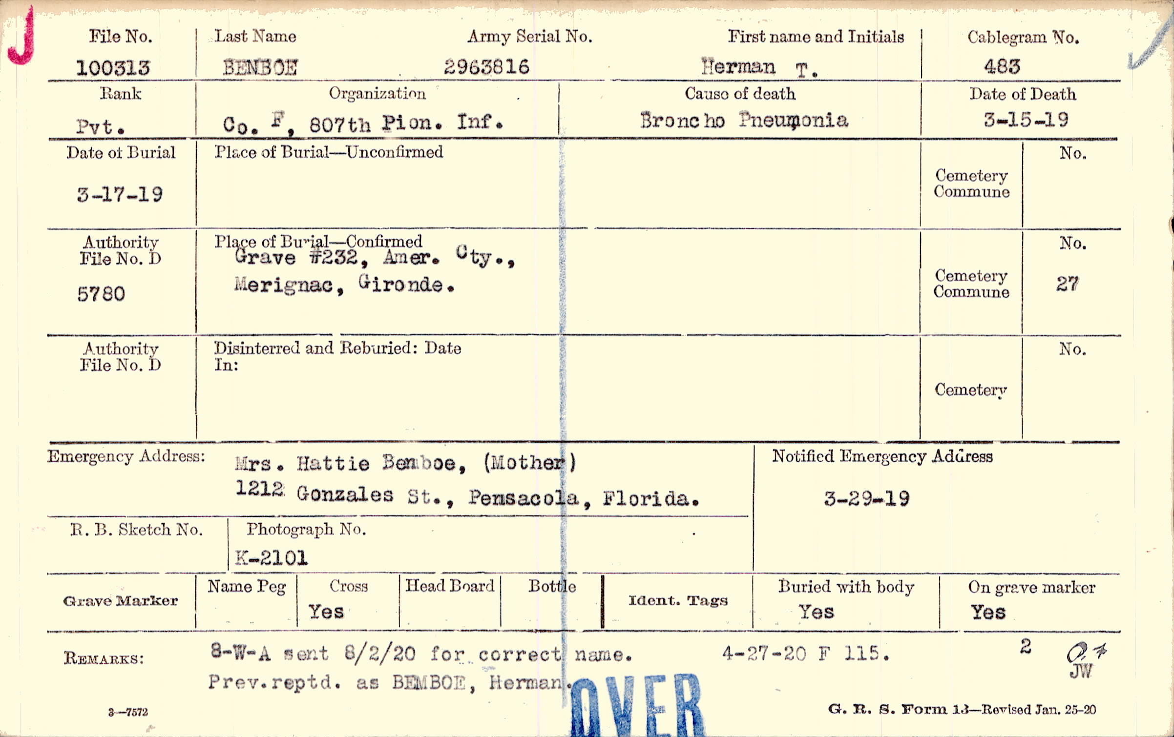 Mrs. Hattie Benboe, (Mother), 1212 Gonzales St., Pensacola, Florida.