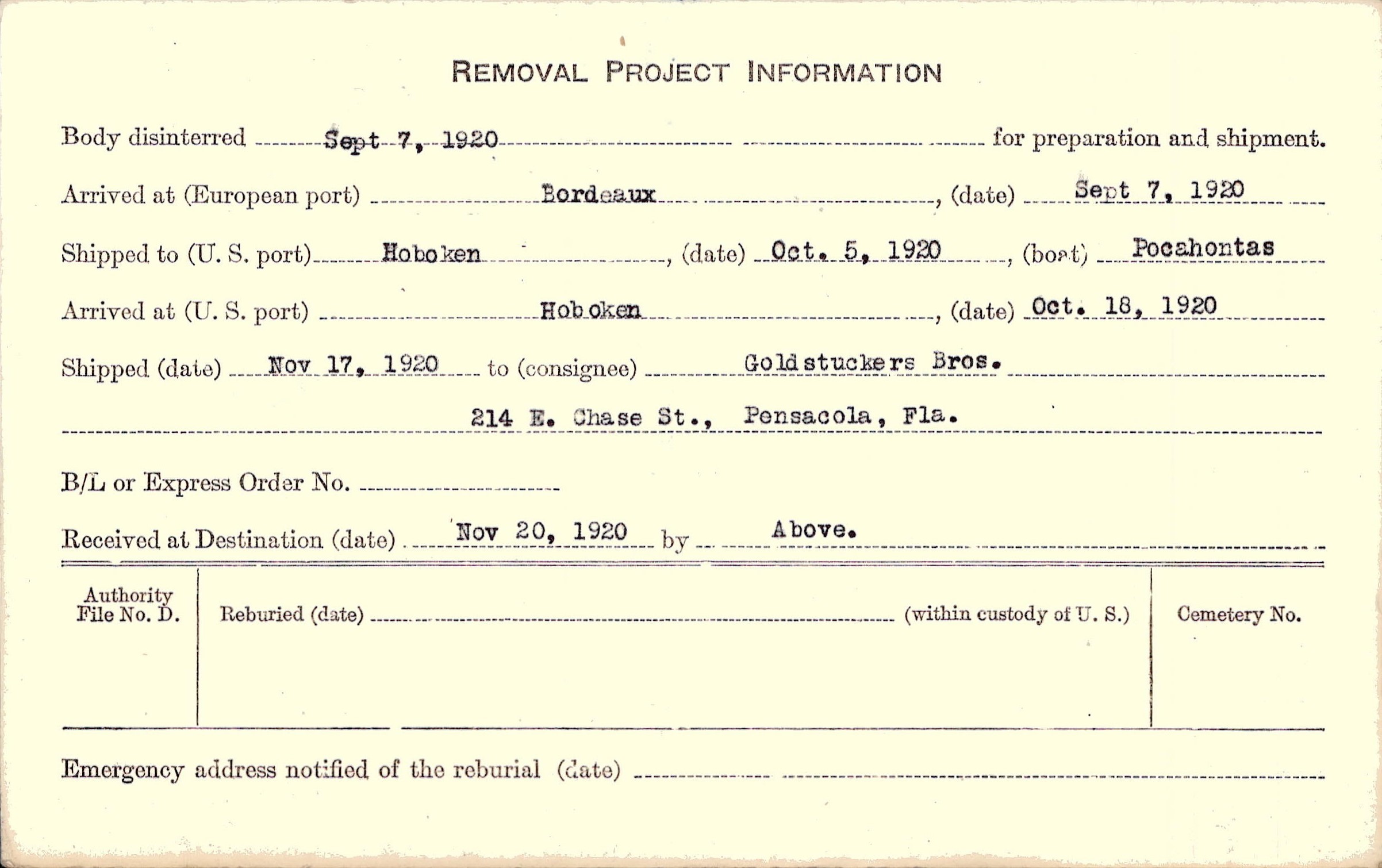 Body disinterred 9/7/1920 for preparation and shipment.