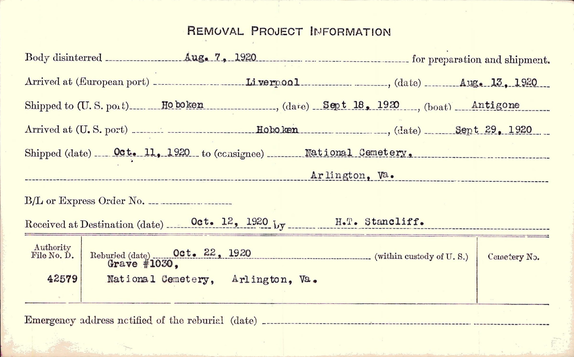 Body disinterred 8/7/1920 for preparation and shipment.