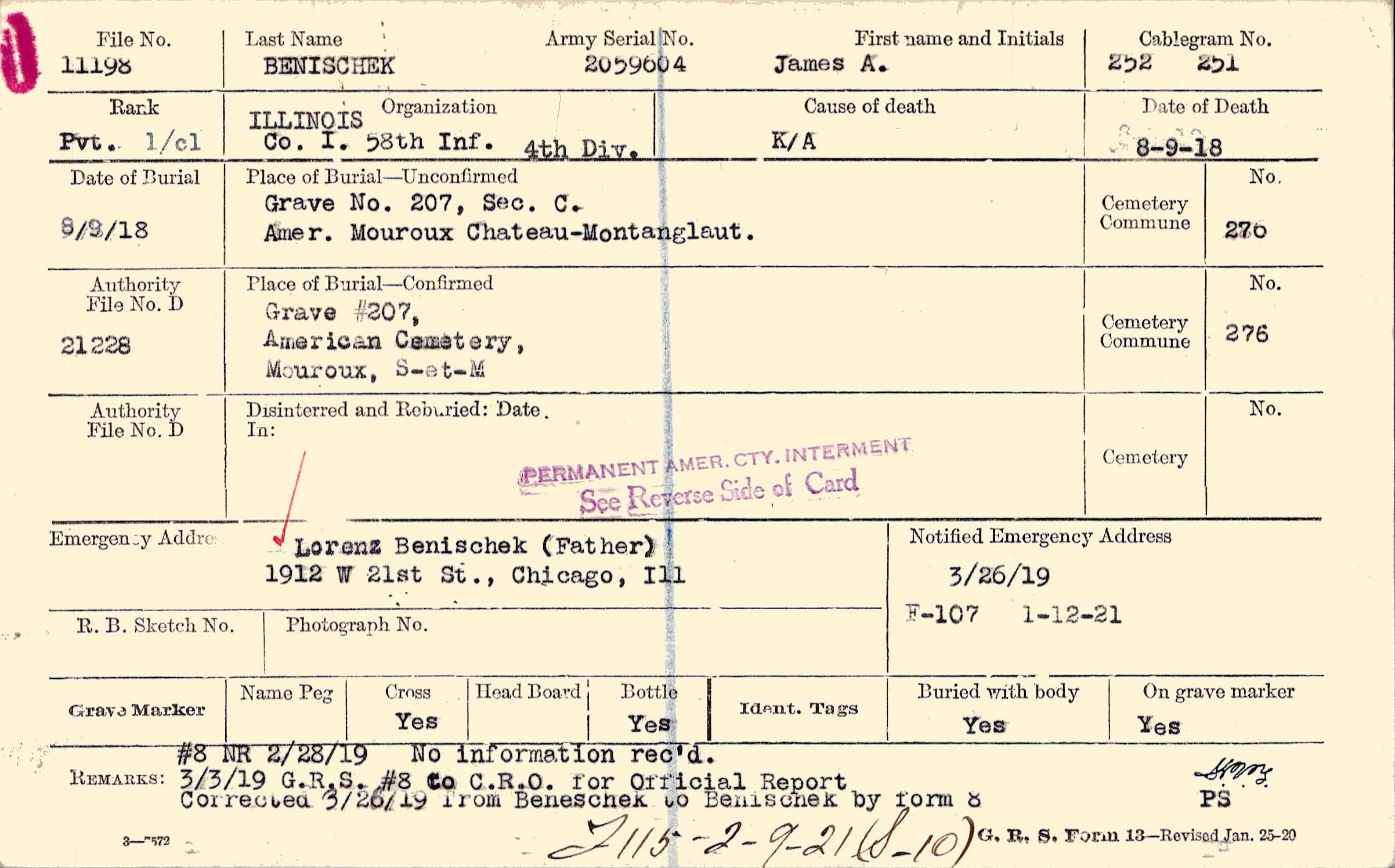 Lorenz Benischek (Father), 1912 W 21st St., Chicago, Ill