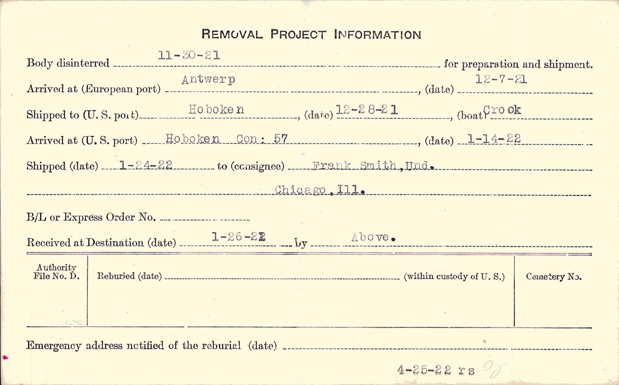 Body disinterred 11/30/1921 for preparation and shipment.