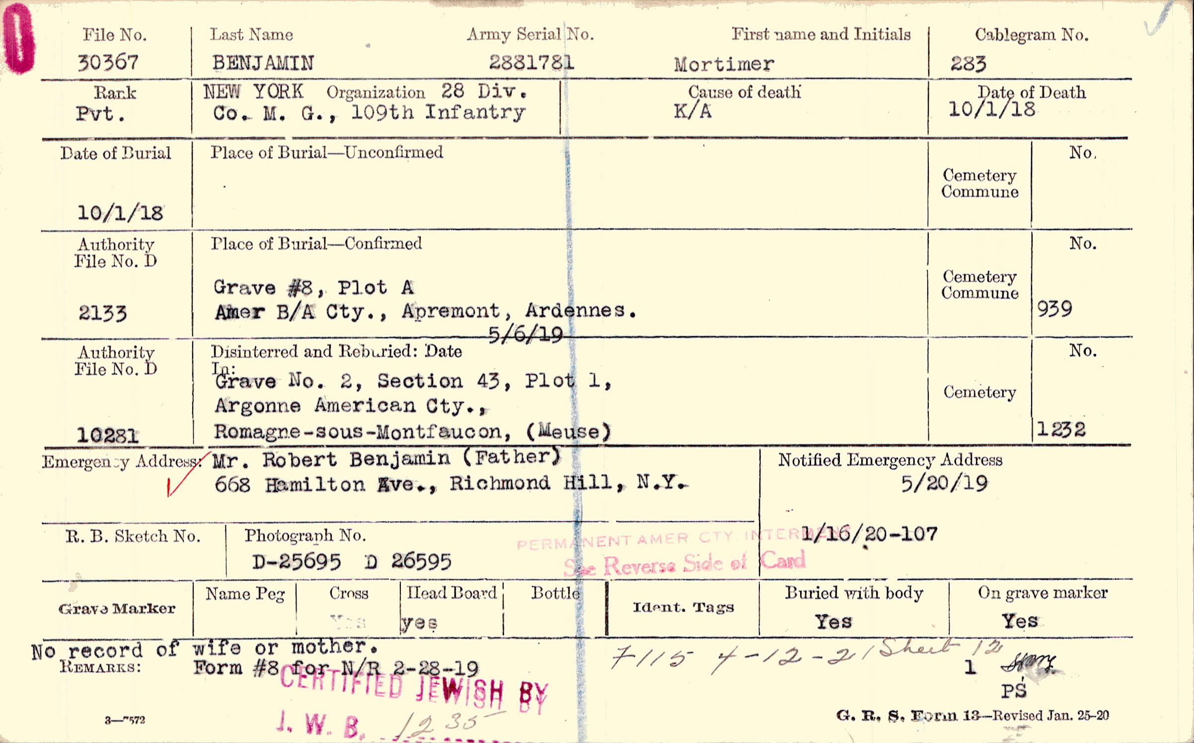 Mr. Robert Benjamin (Father), 668 Hamilton Ave., Richmond Hill, N.Y.