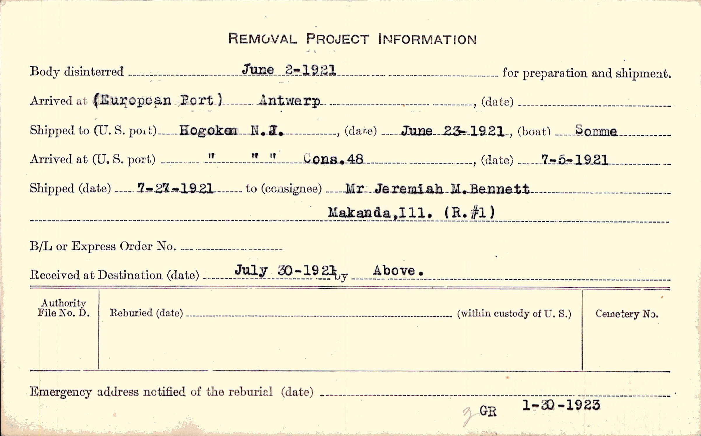 Body disinterred 6/2/1921 for preparation and shipment.