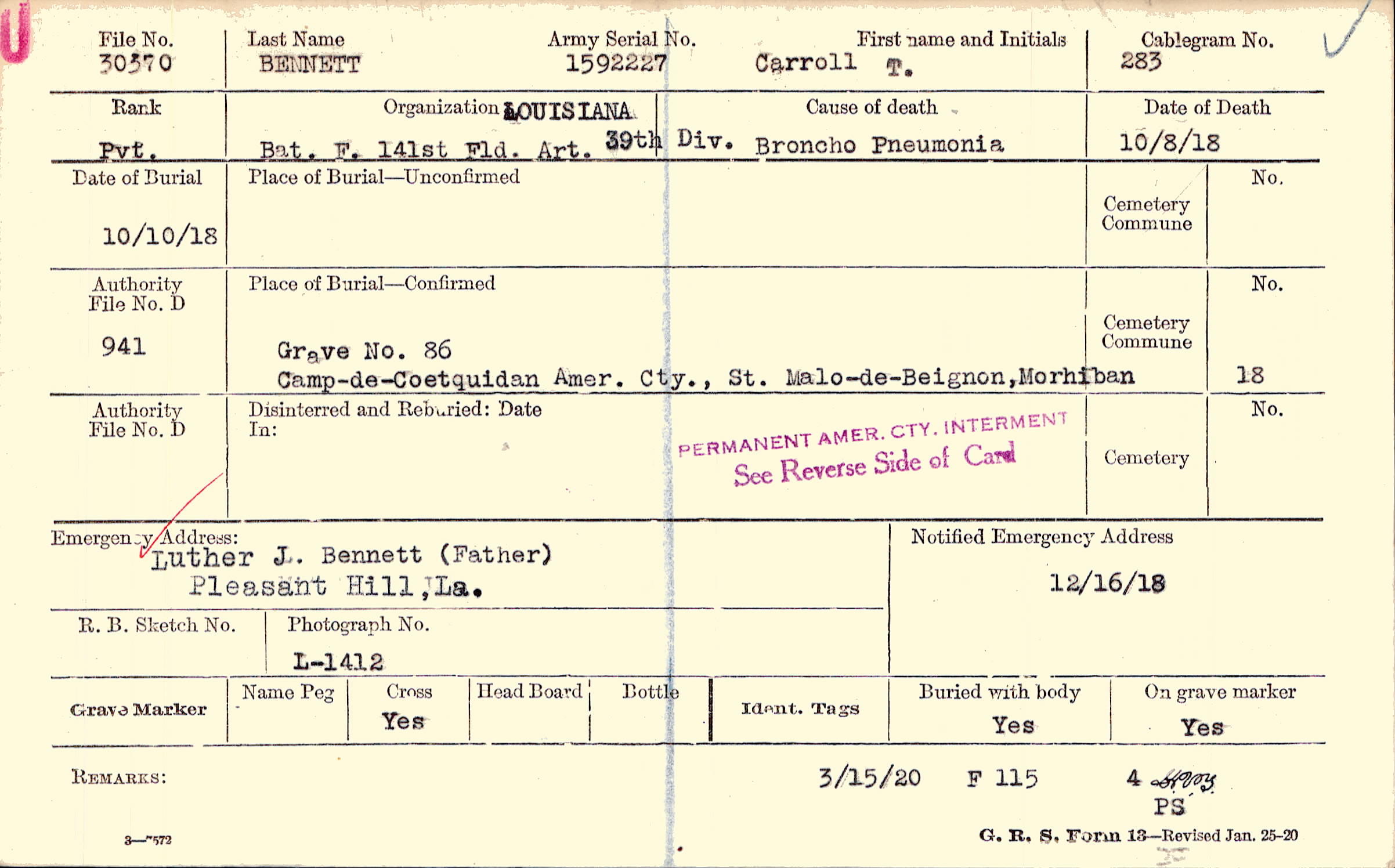 Luther J. Bennett (Father), Pleasant Hill, La.
