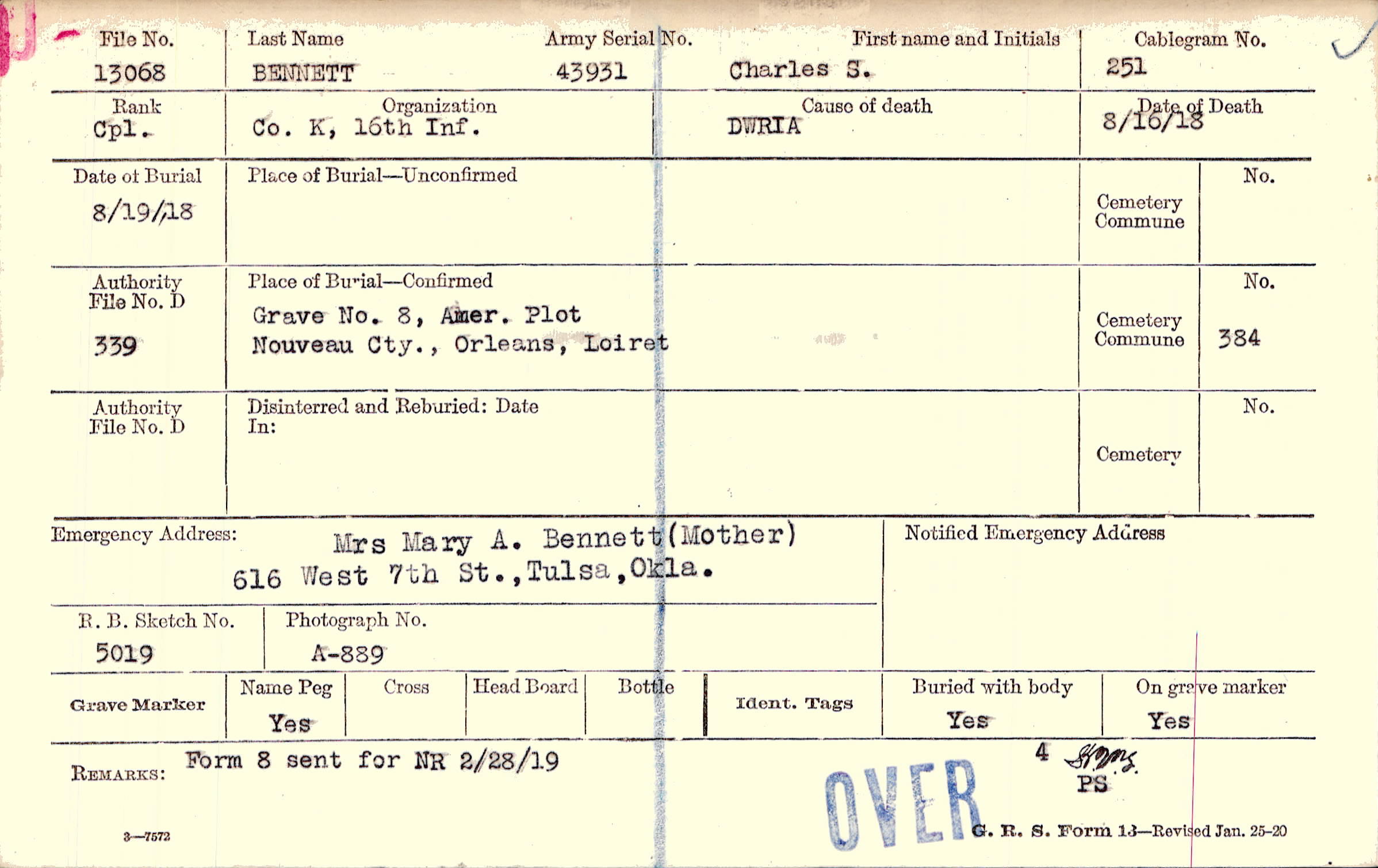 Mrs Mary A. Bennett(Mother), 616 West 7th St., Tulsa, Okla.