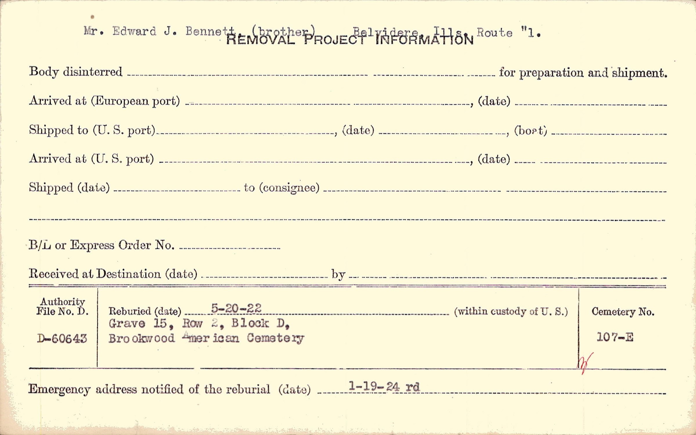 Mr. Edward J. Bennett , (brother), Belvidere, Ills., Route "1. |