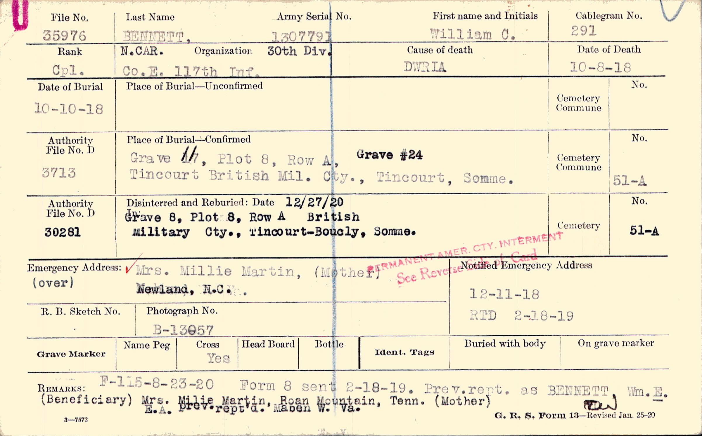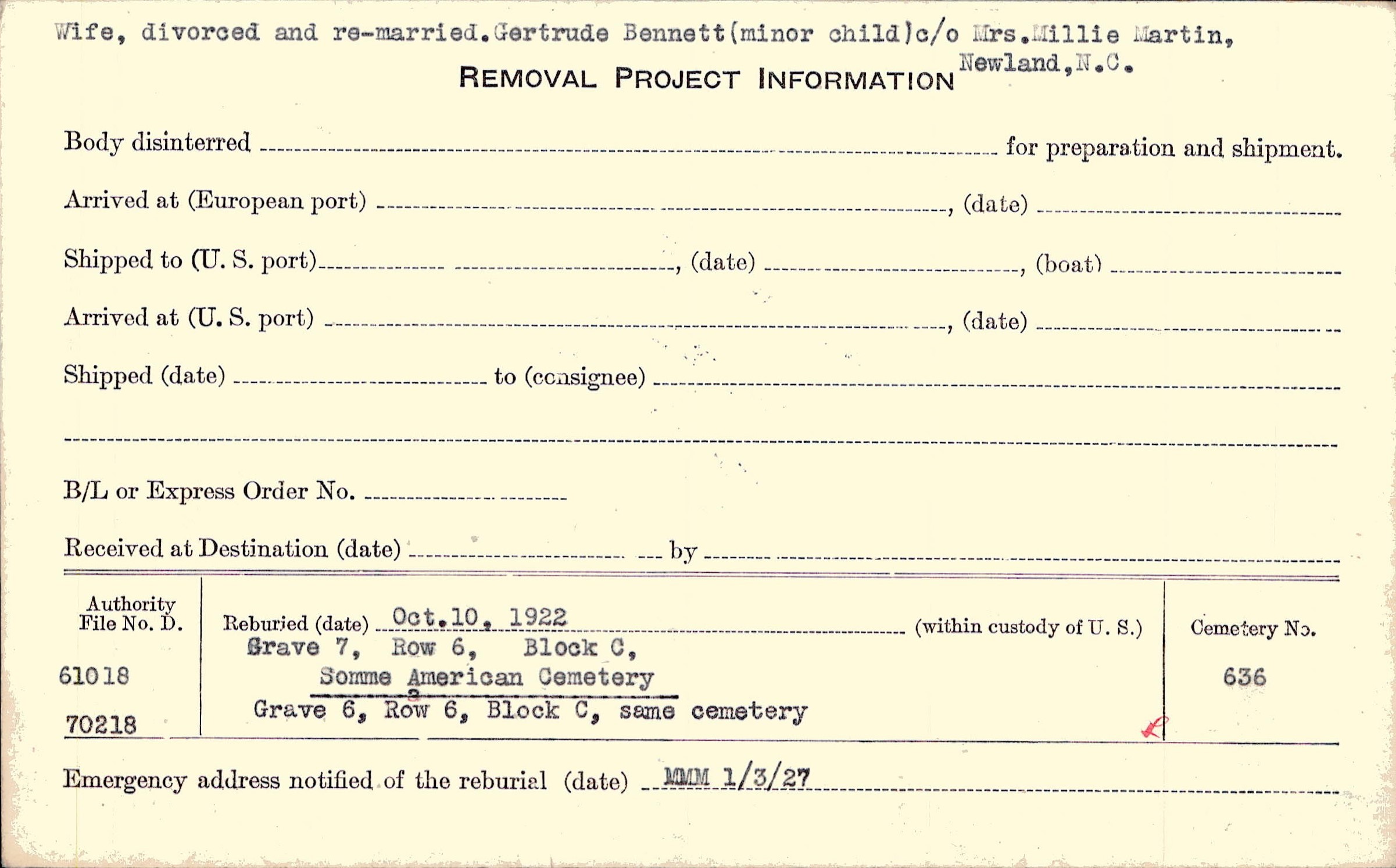Wife, divorced and re-married. Gertrude Bennett (minor child) c/o Mrs. Millie Martin, Newland, N.C. |