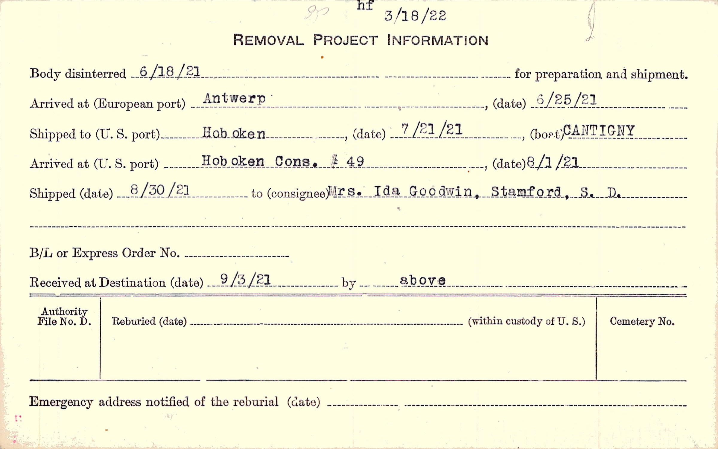 Body disinterred 6/18/1921 for preparation and shipment.