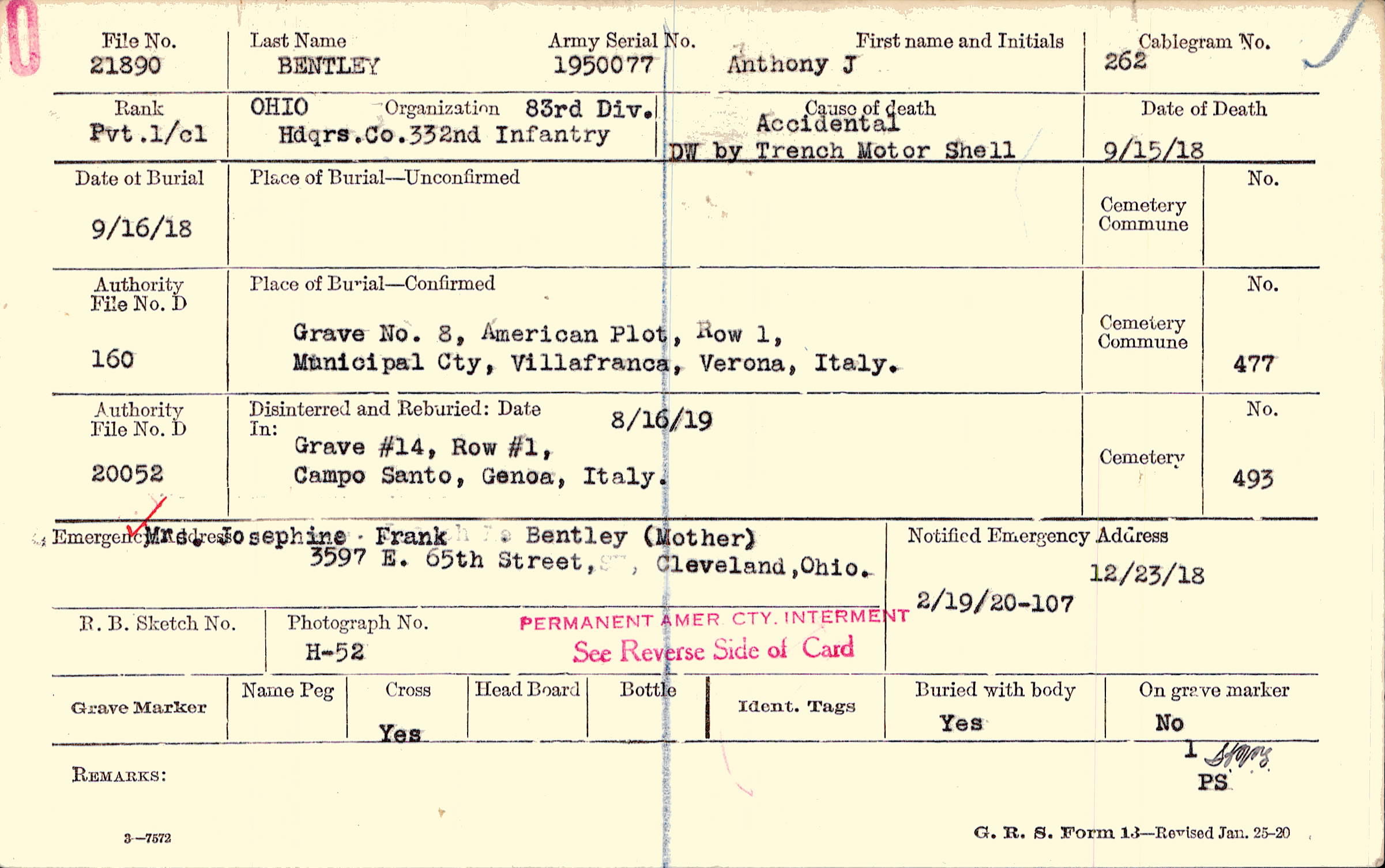 Mrs. Josephine Frank Bentley (Mother), 3597 E. 65th Street, Cleveland, Ohio.