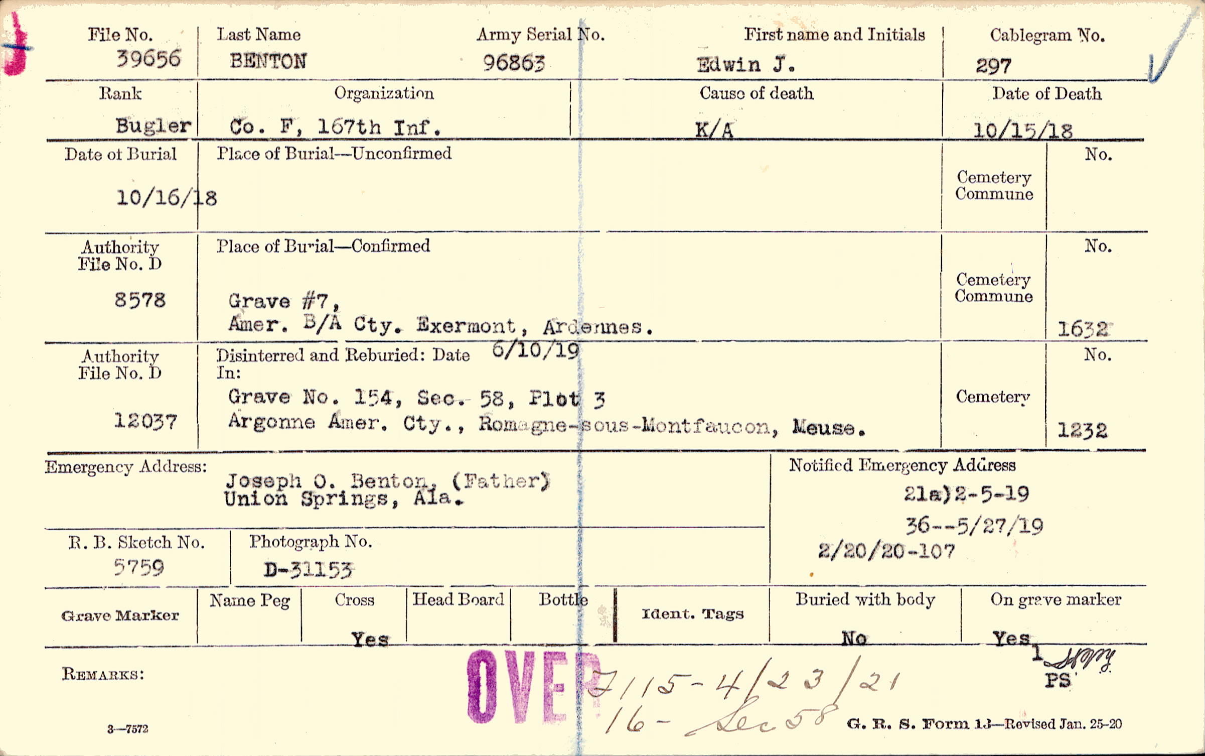Form 21a: )2/5/1919, Form 36: 5/27/1919, Form 107: 2/20/1920