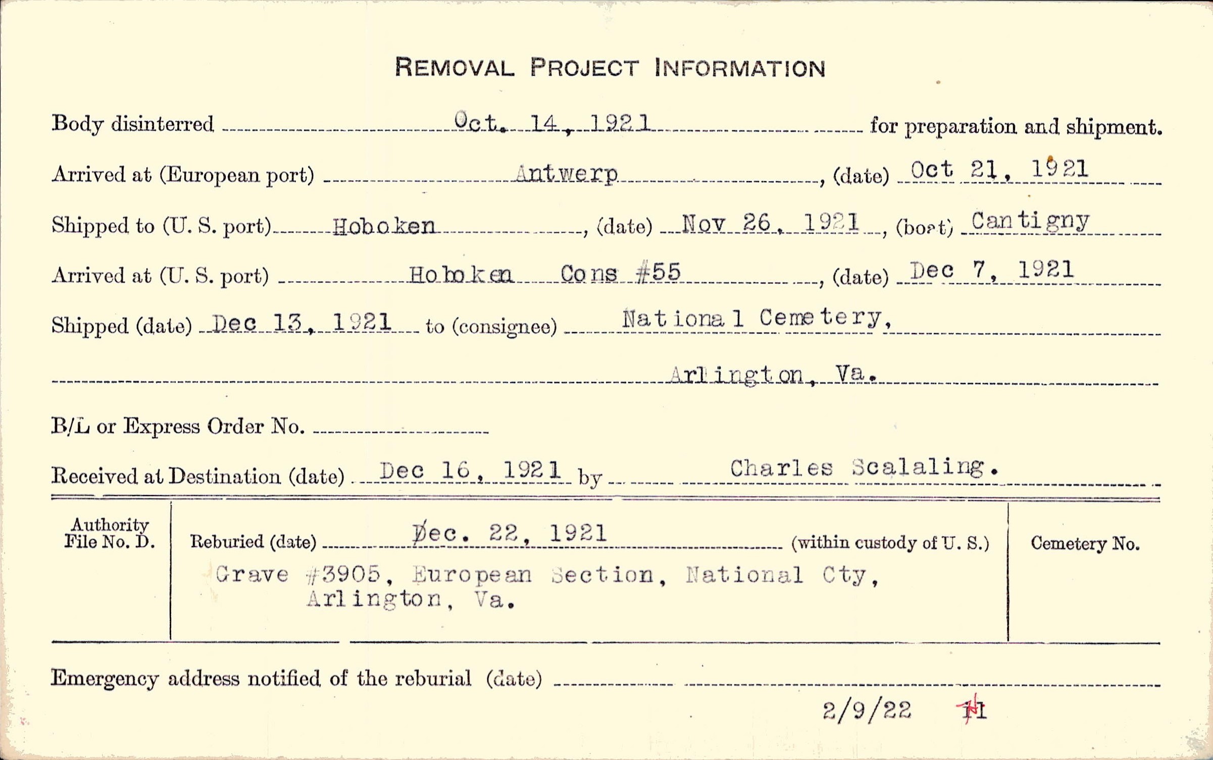 Body disinterred 10/14/1921 for preparation and shipment.
