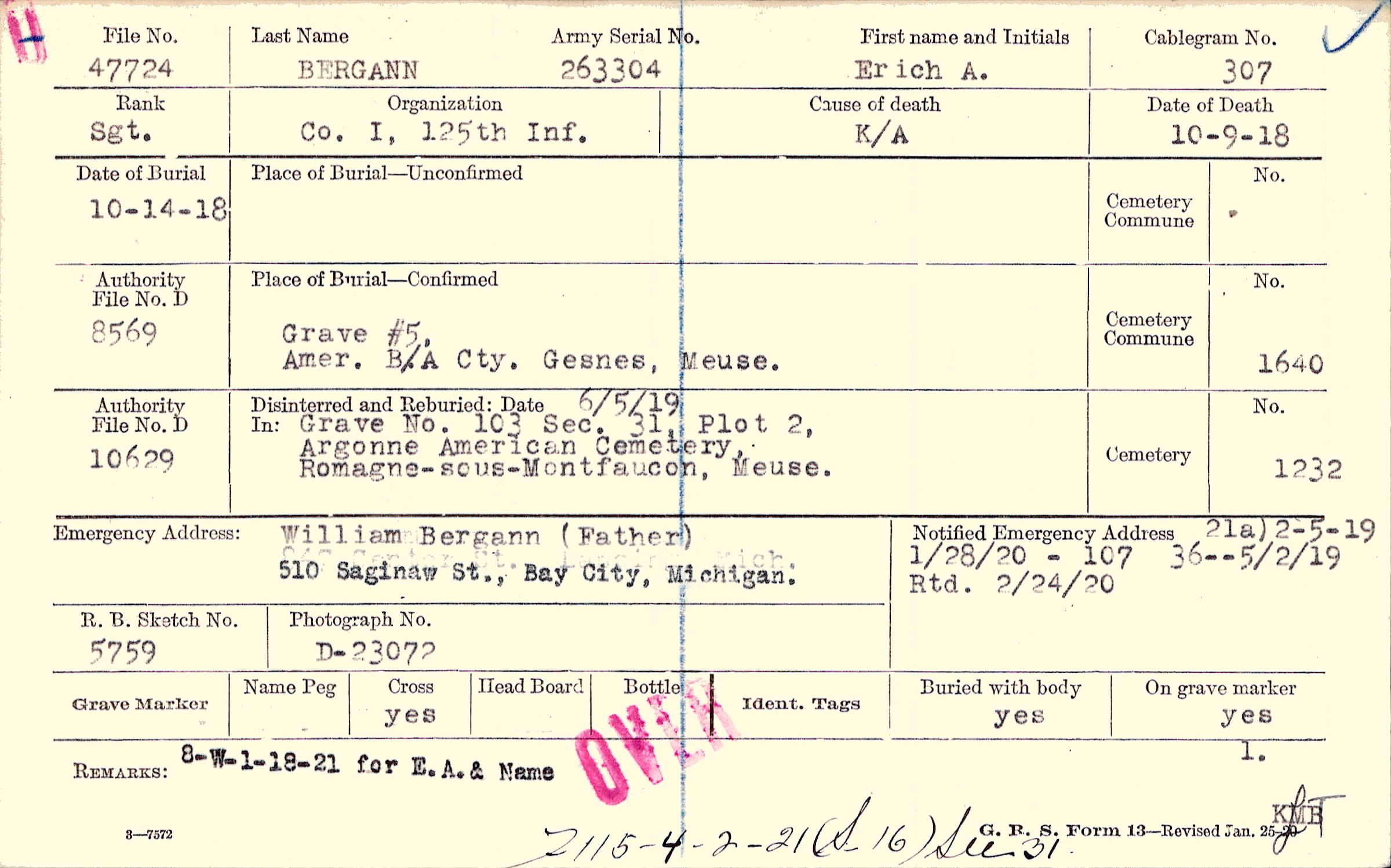 Form 21a: )2/5/1919, Form 107: 1/28/1920, Form 36: 5/2/1919, Rtd 2/24/1920