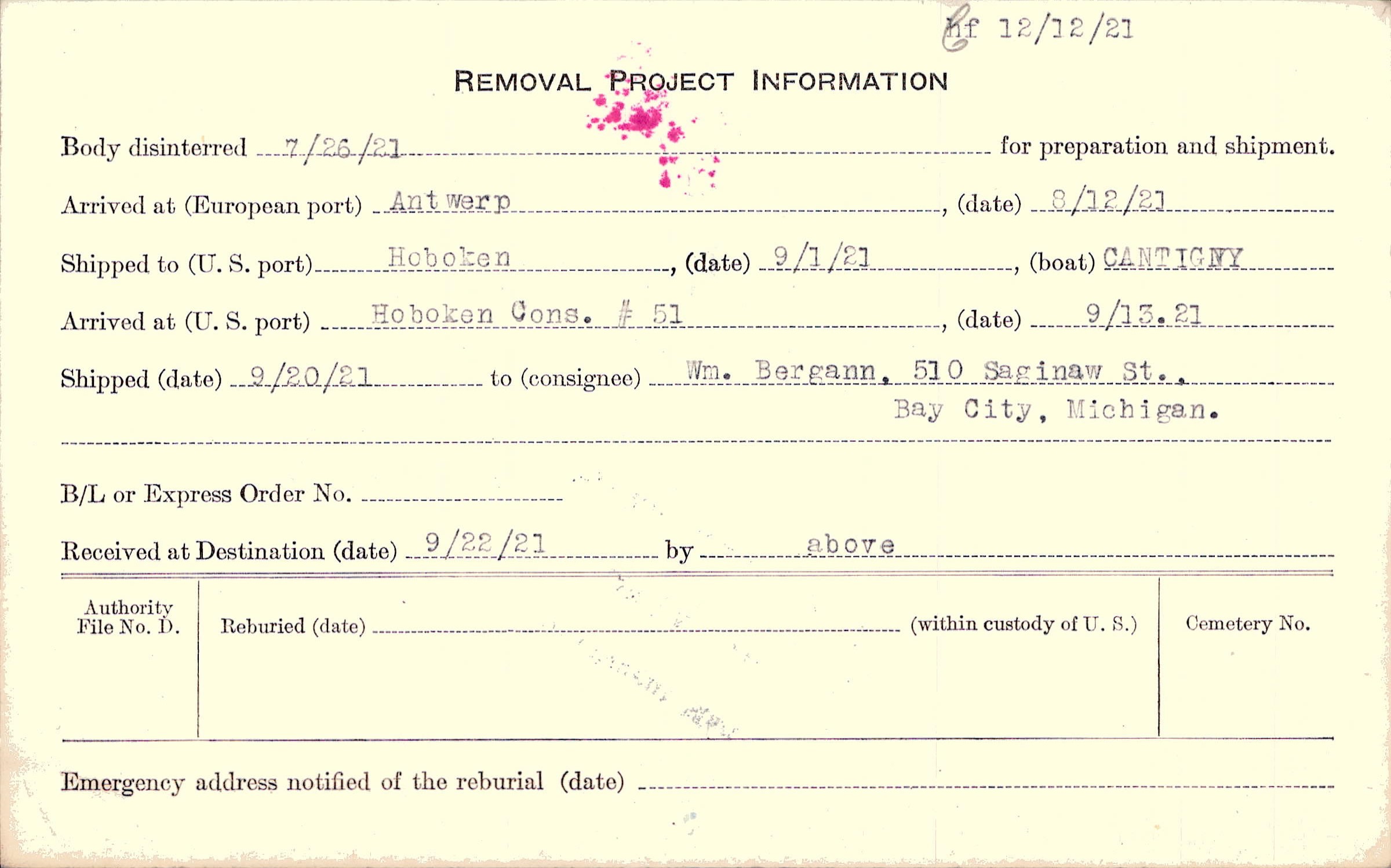 Body disinterred 7/26/1921 for preparation and shipment.