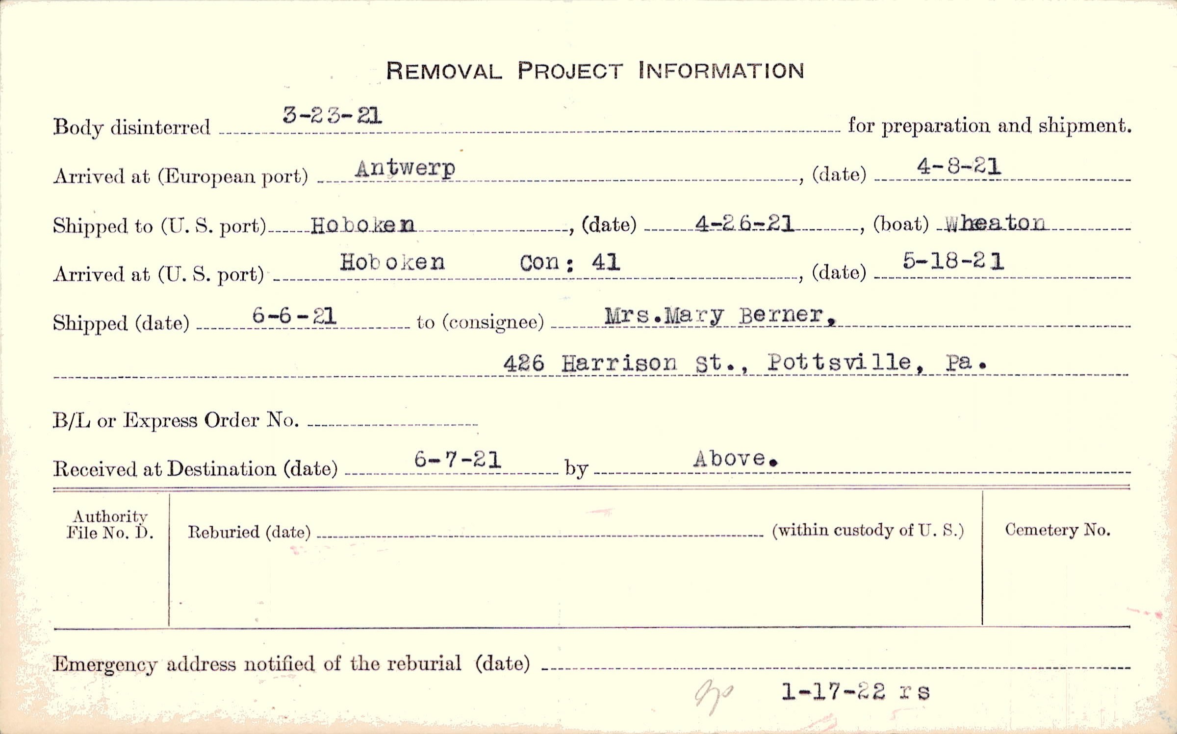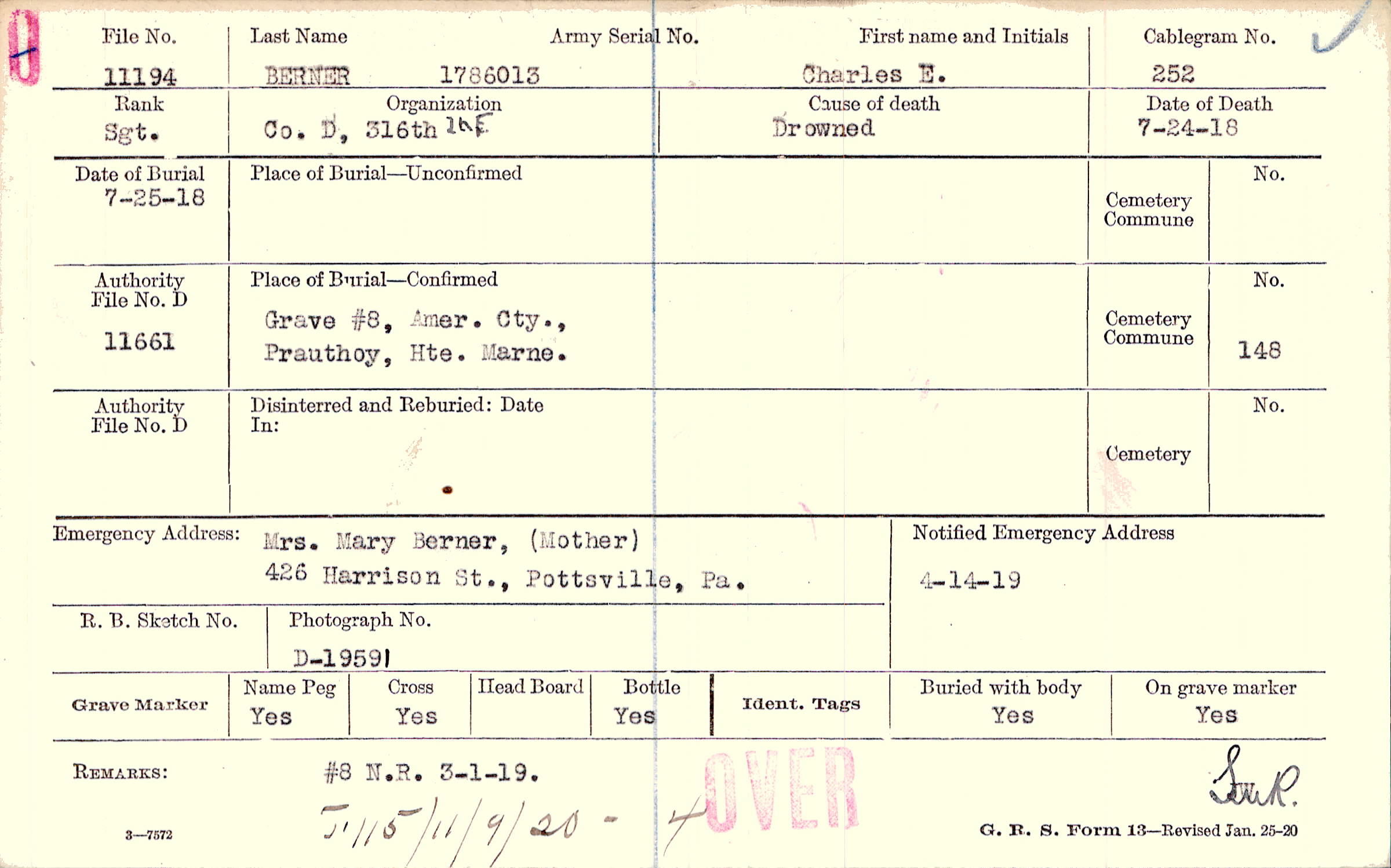 Mrs. Mary Berner, (Mother), 426 Harrison St., Pottsville, Pa.