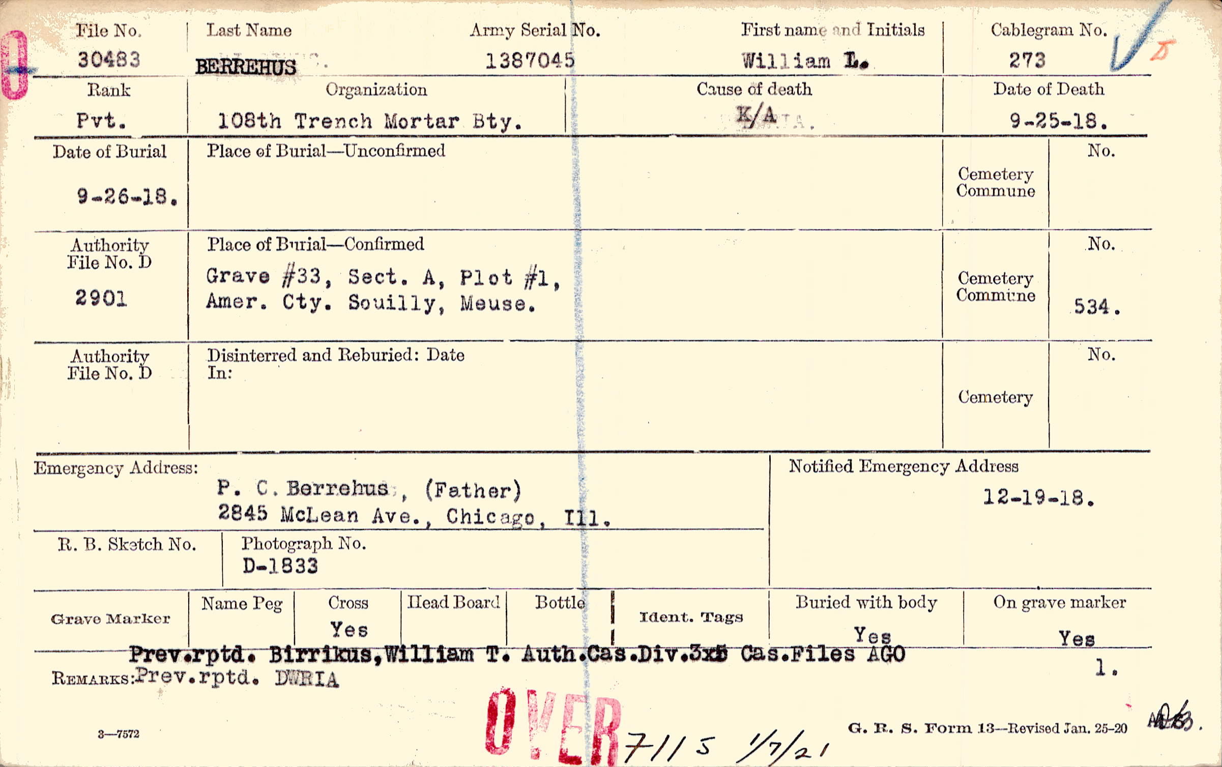 Prev. rptd. Birrikus, William T. Auth. Cas. Div. 3x5 Cas. Files AGO Prev. rptd. DWRIA, 7115 1/7/21
