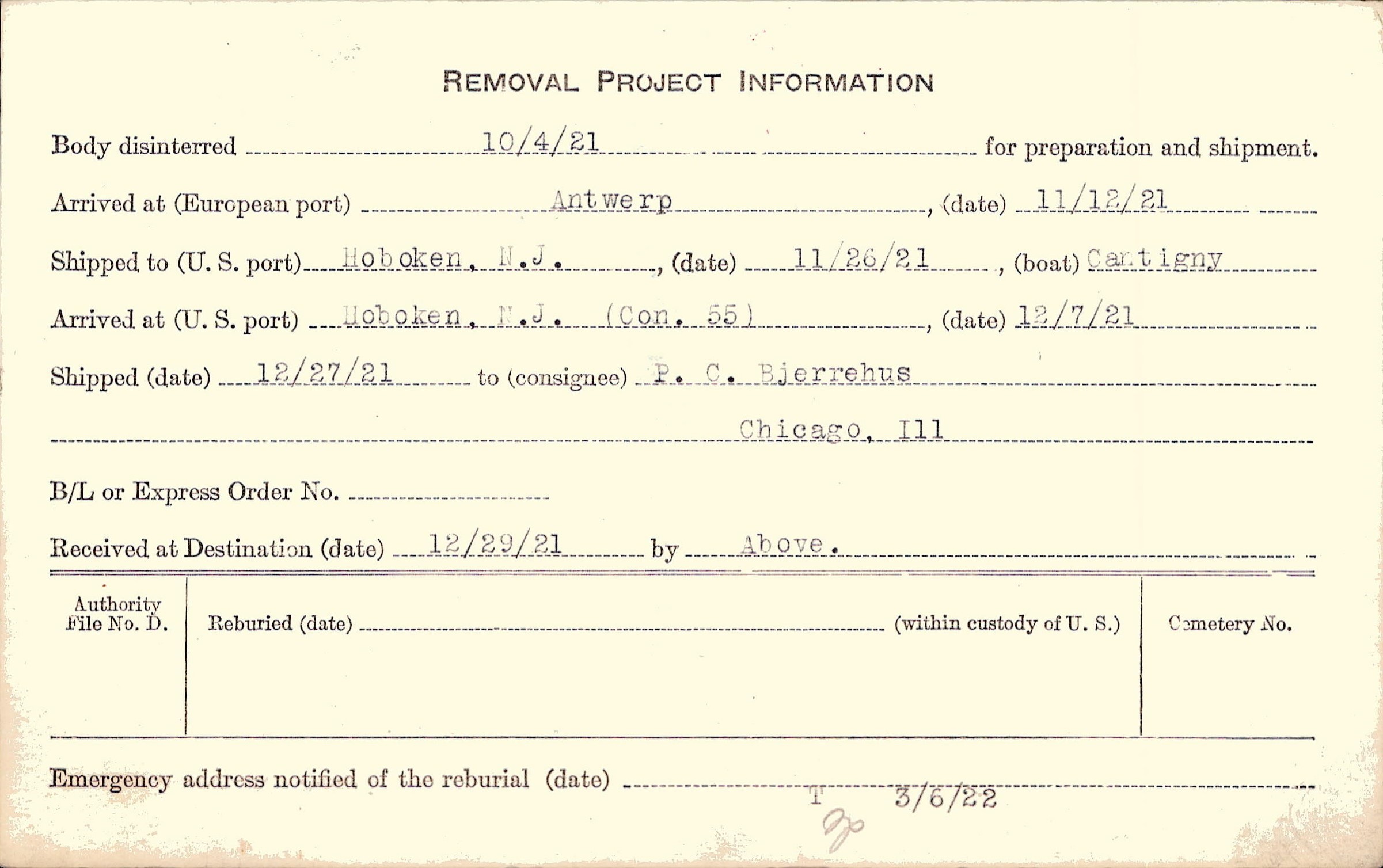 Body disinterred 10/4/1921 for preparation and shipment.