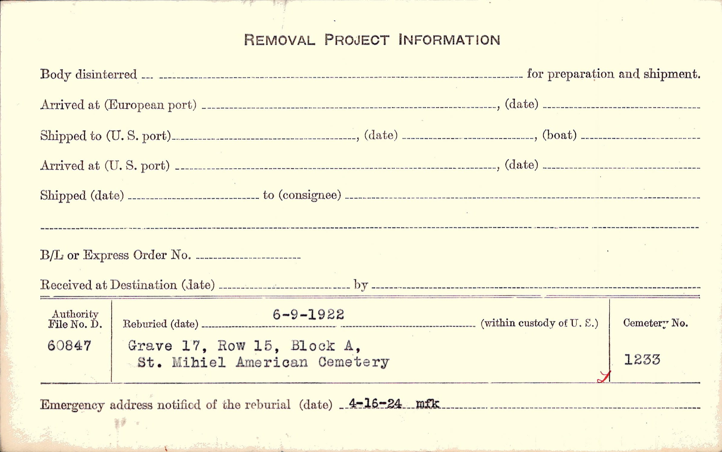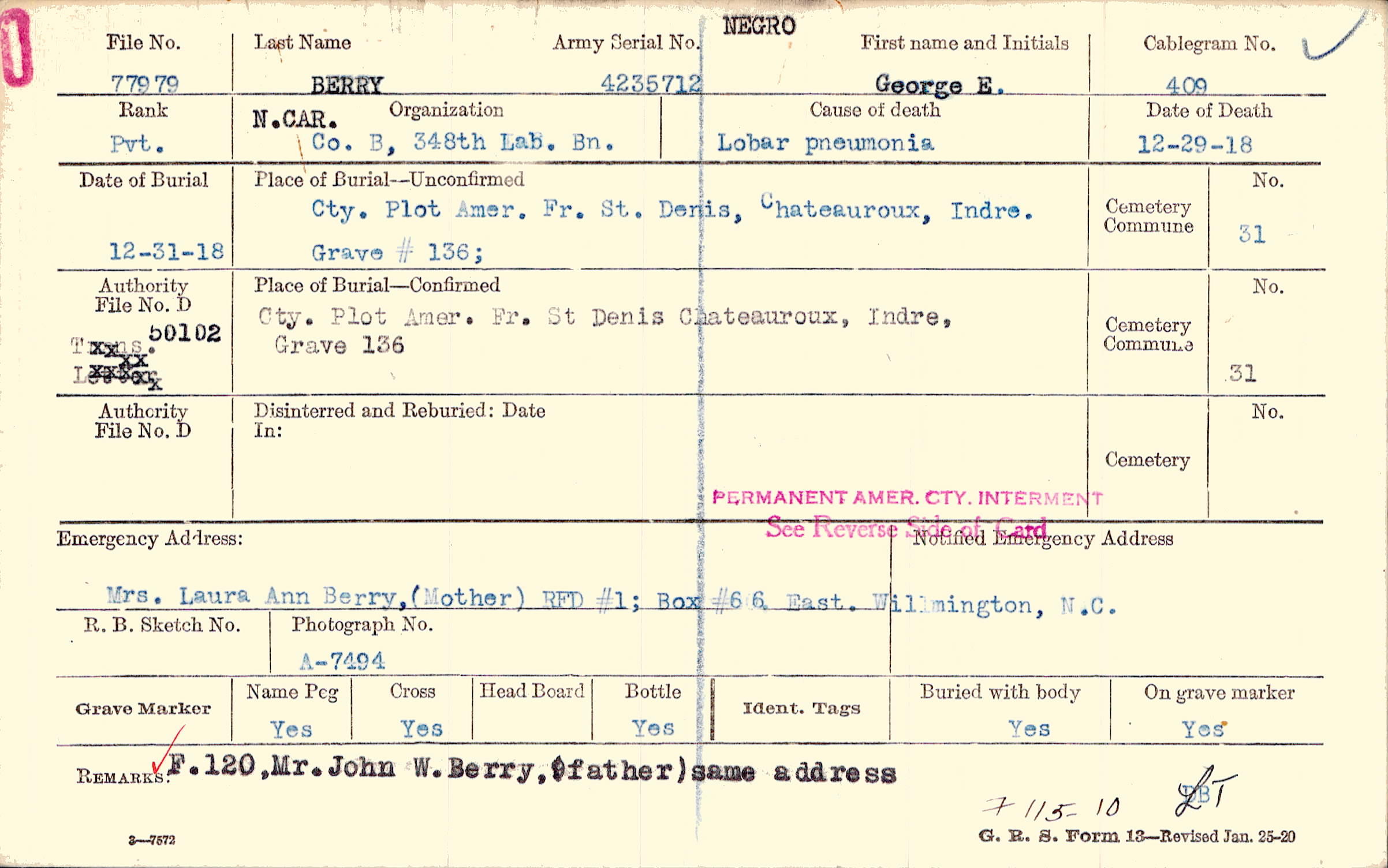 Grave 136, Fr. Cty. Plot Amer., St Denis, Chateauroux, Indre