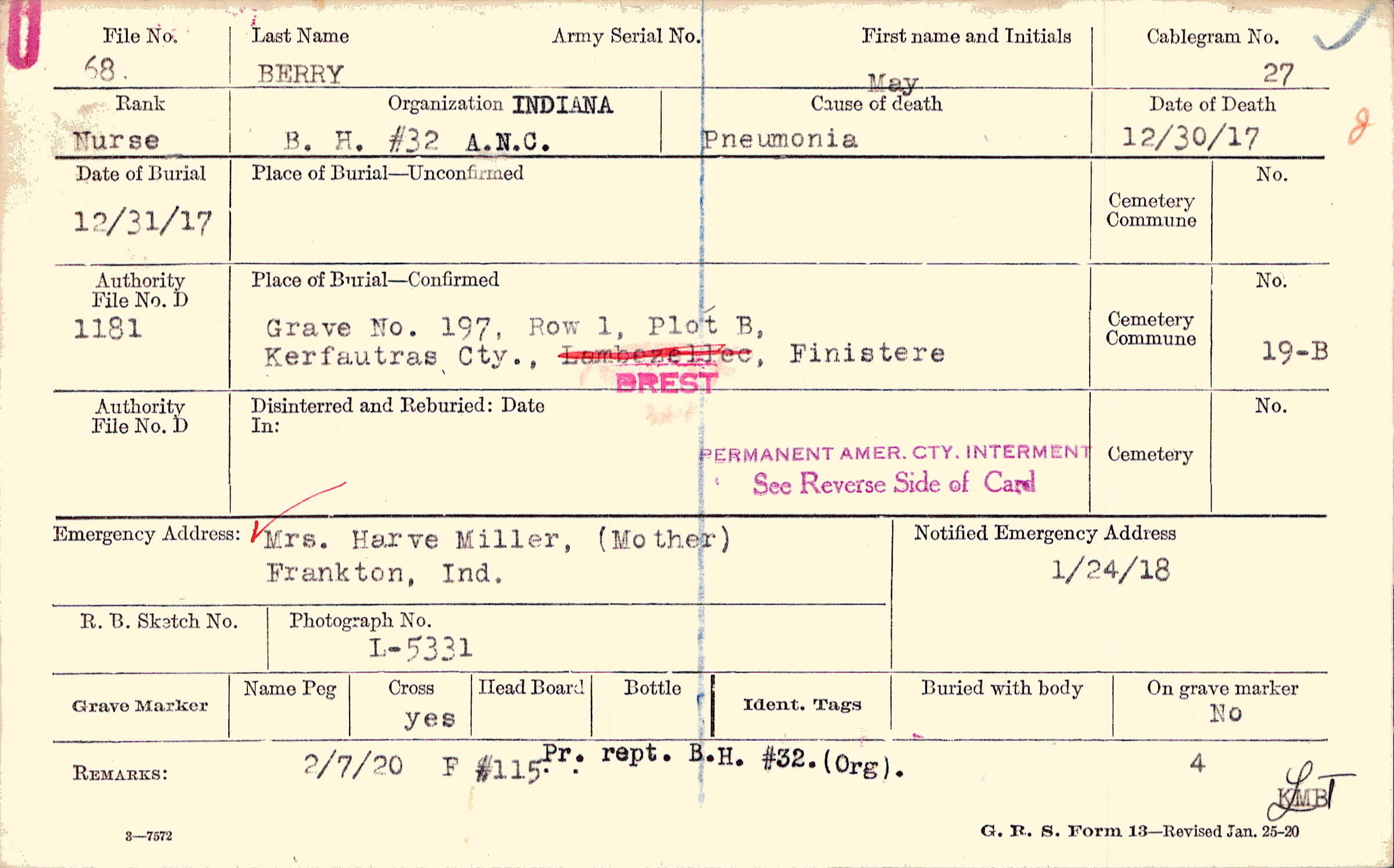 Grave 197, Row 1, Plot B, Kerfautras Cty., Brest, Finistere.
