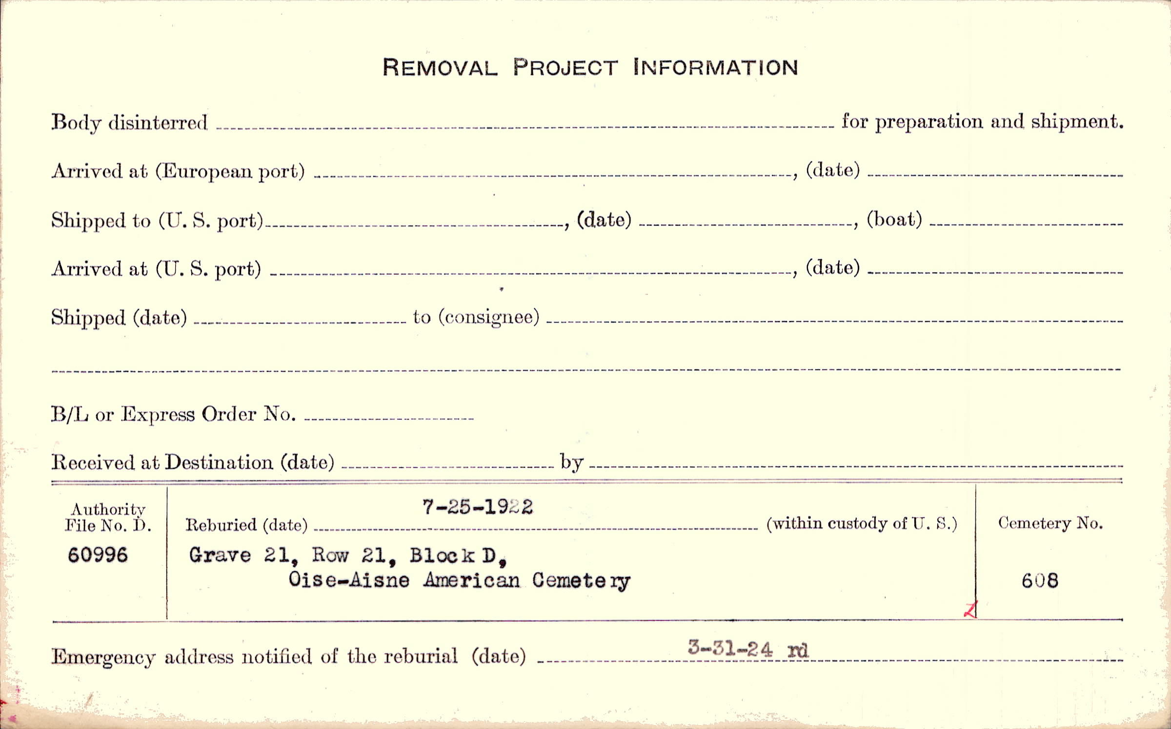 | Permanent Burial in Foreign Cemetery |