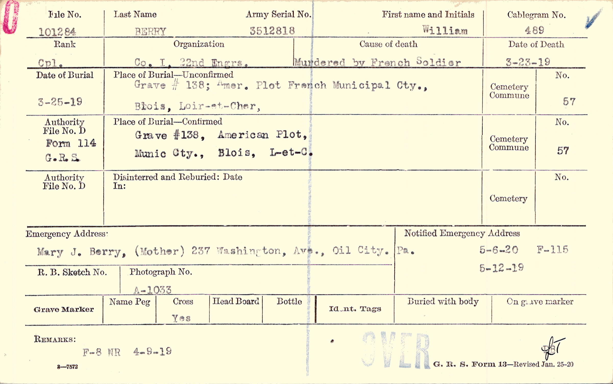 Grave #138, American Plot, Munic Cty., Blois, L-et-C