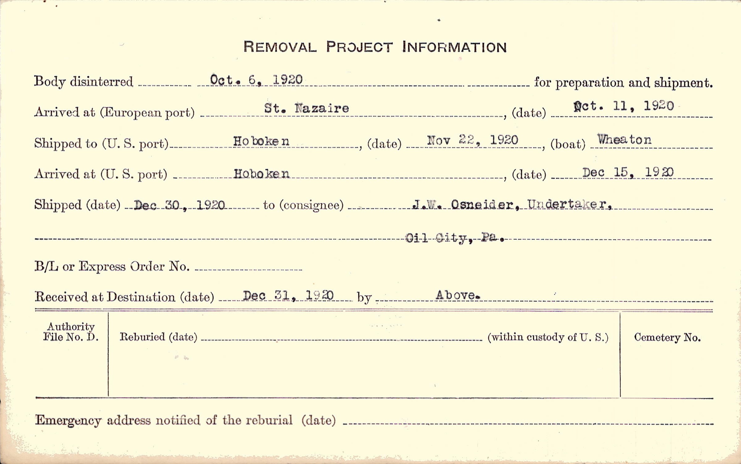 to J.W. Osneider, Undertaker, Oil City, Pa.