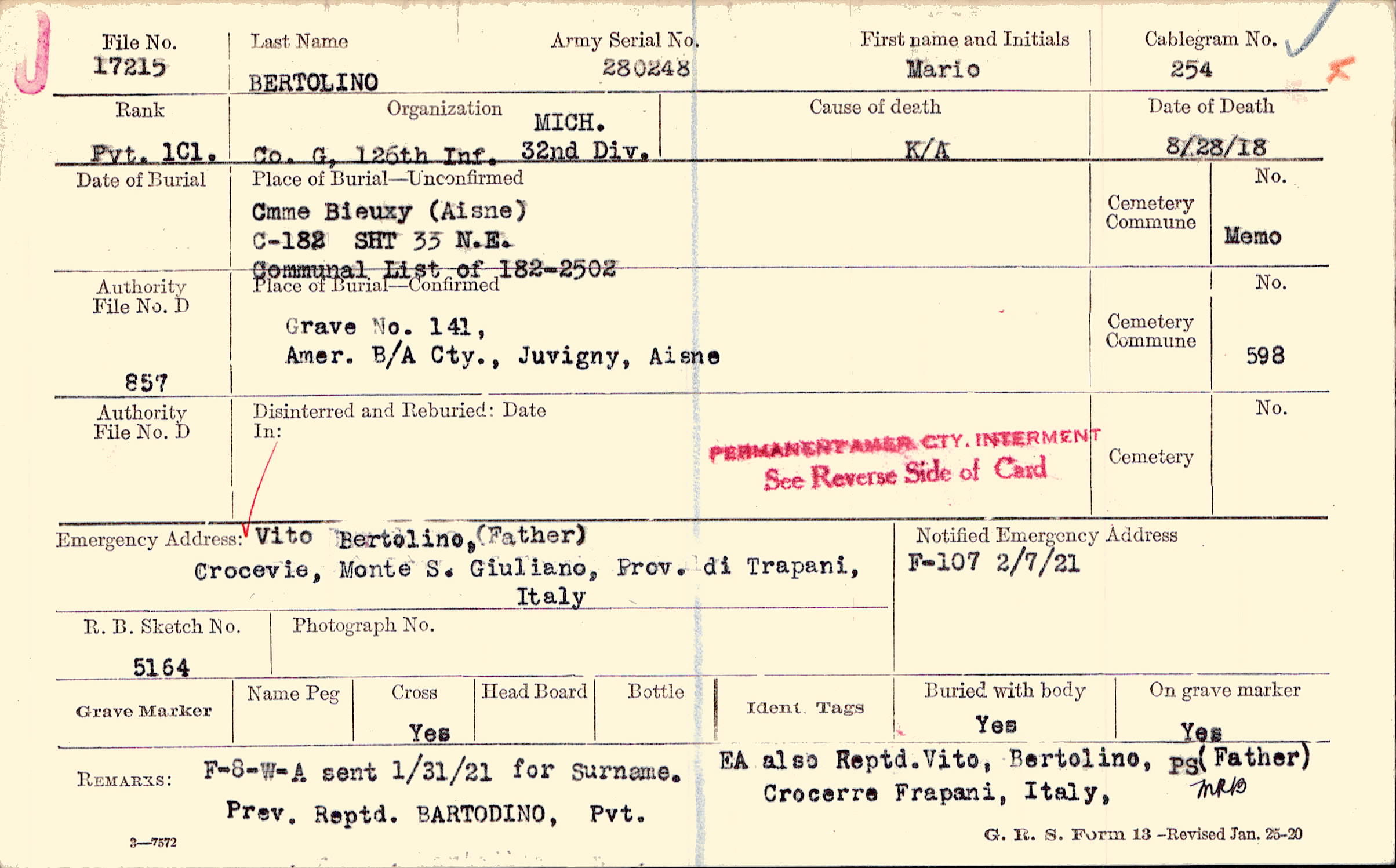 EA also reptd. Vito, Bertolino, (Father) Crocerre Frapani, Italy Prev.reptd. BARTODINO, Pvt., F-8-W-A sent 1/31/21 for Surname.
