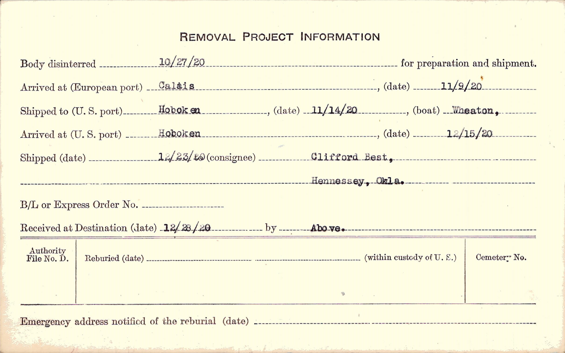 Body disinterred 10/27/1920 for preparation and shipment.