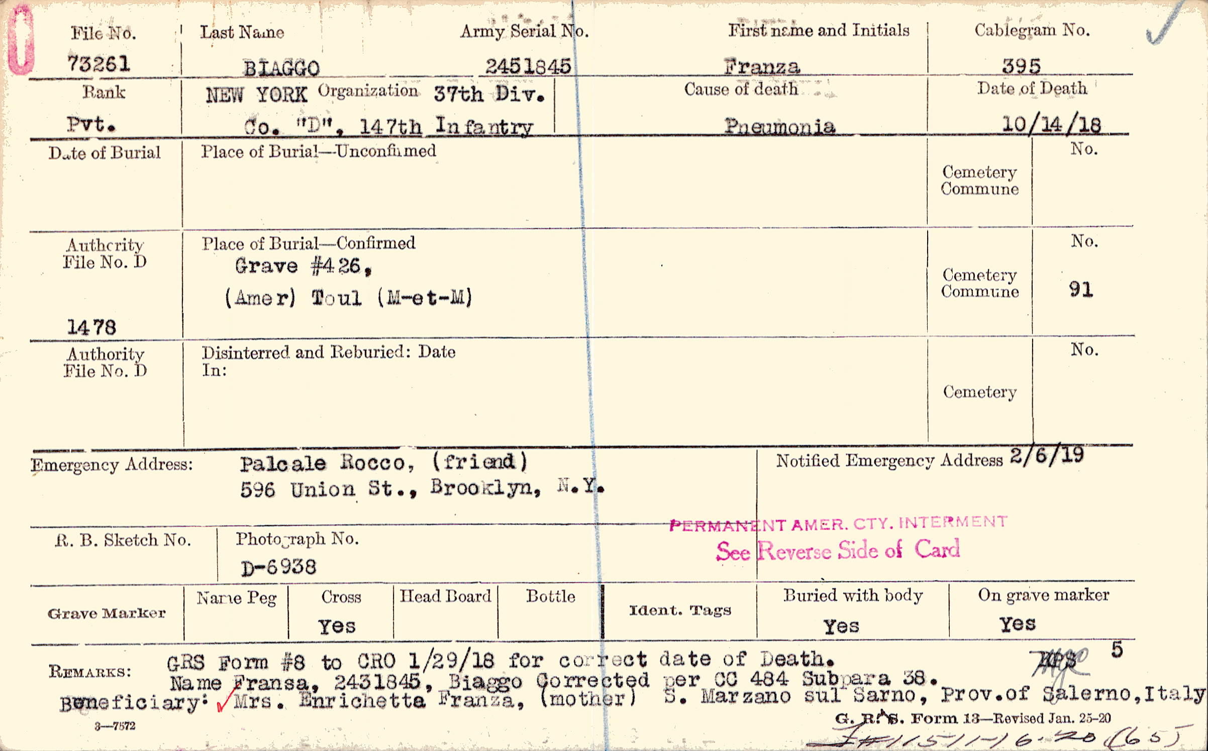 Palcale Rocco, (friend), 596 Union St., Brooklyn, N.Y.