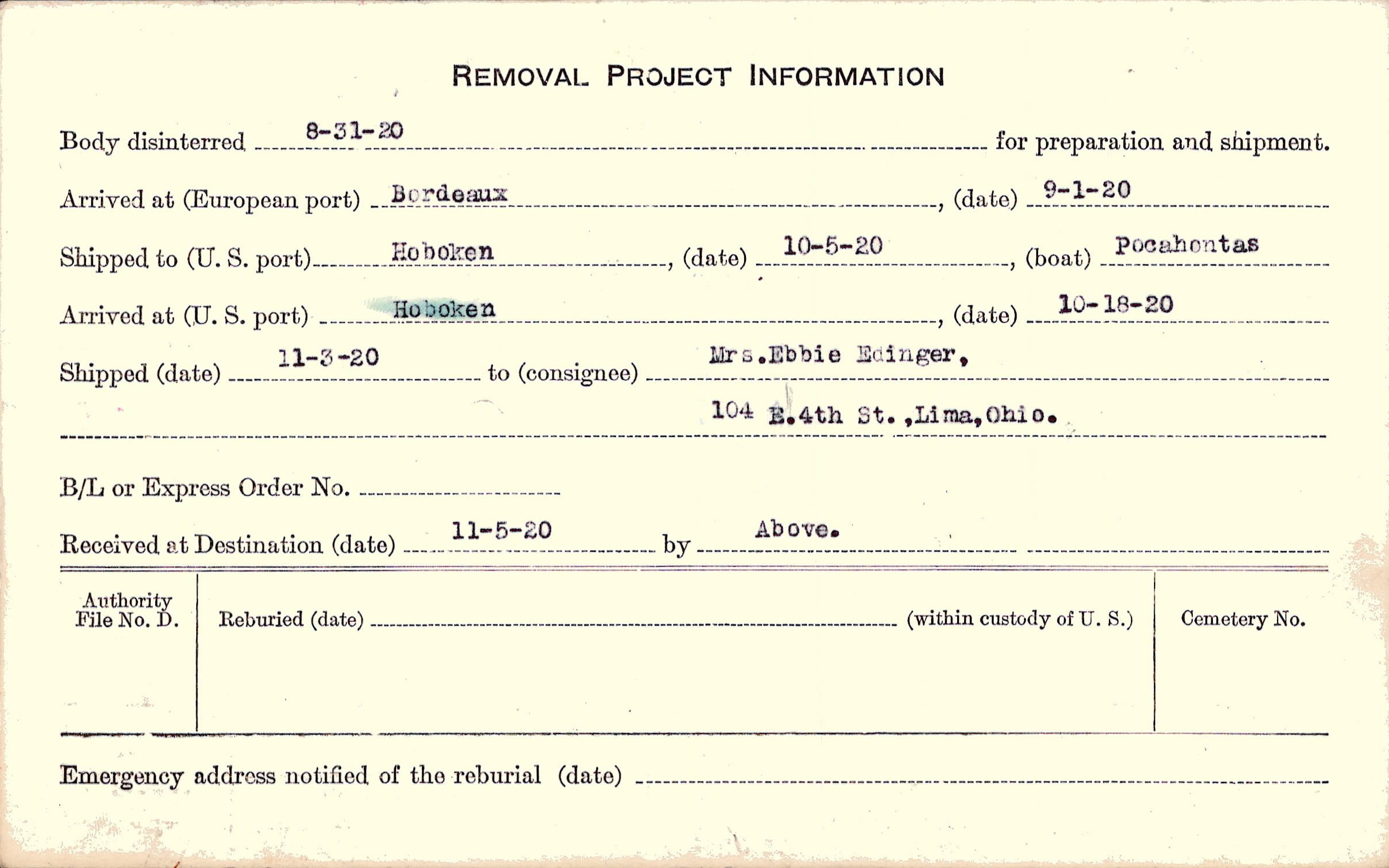 Body disinterred 8/31/1920 for preparation and shipment.