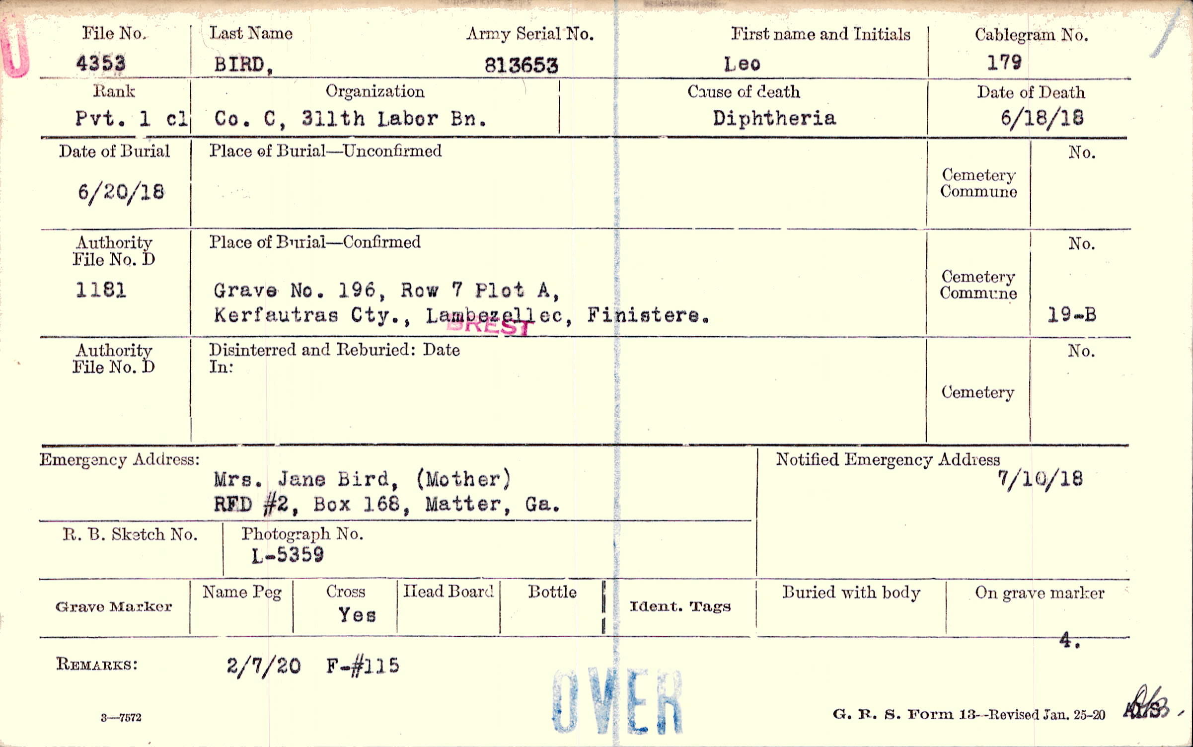 Mrs. Jane Bird, (Mother), RFD #2, Box 168, Matter, Ga.