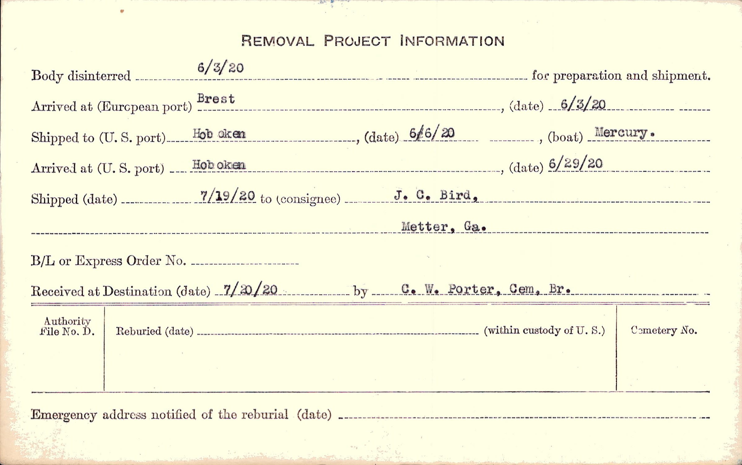 Body disinterred 6/3/1920 for preparation and shipment.