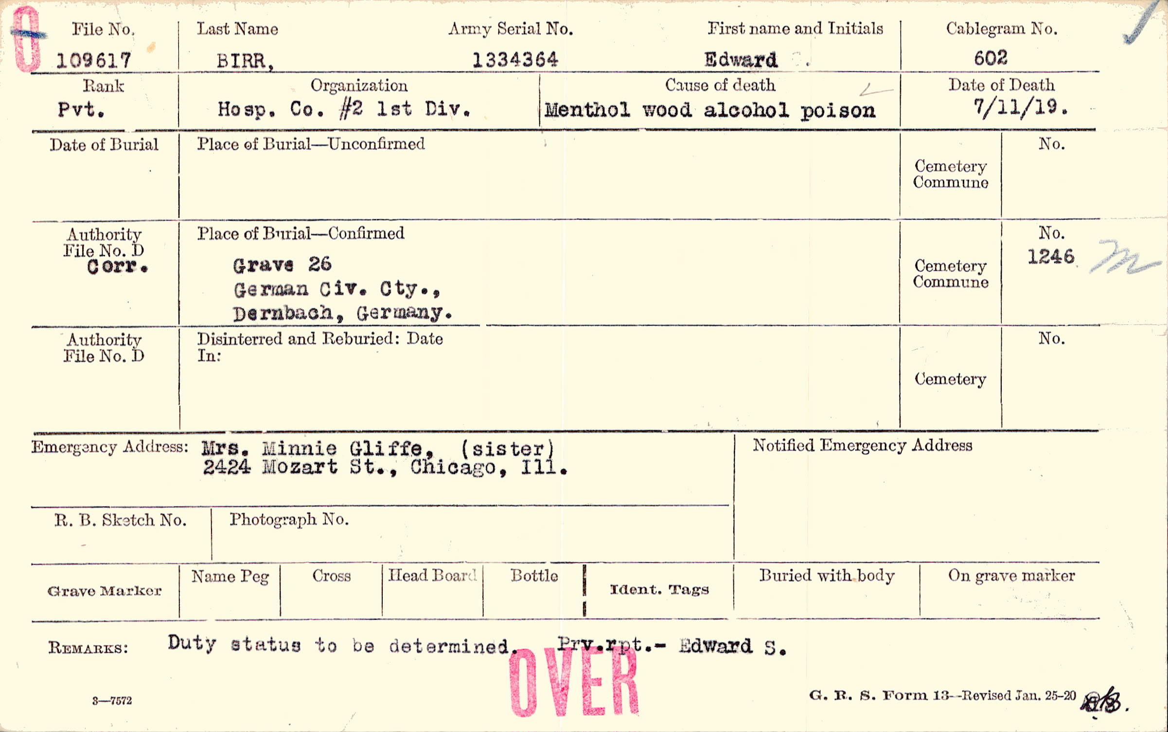Mrs. Minnie Gliffe, (sister), 2424 Mozart St., Chicago, Ill.