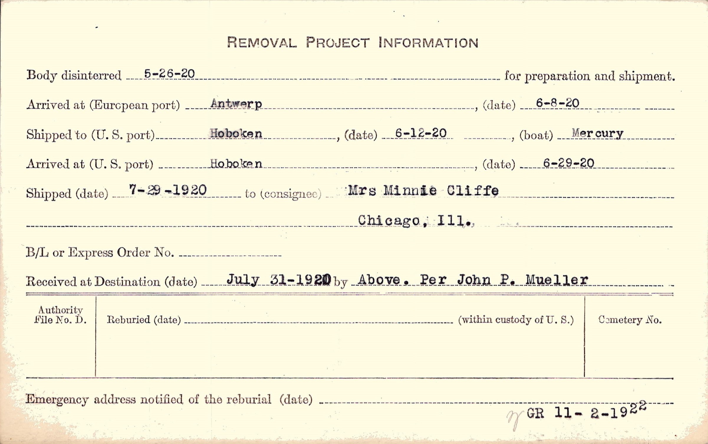 Body disinterred 5/26/1920 for preparation and shipment.