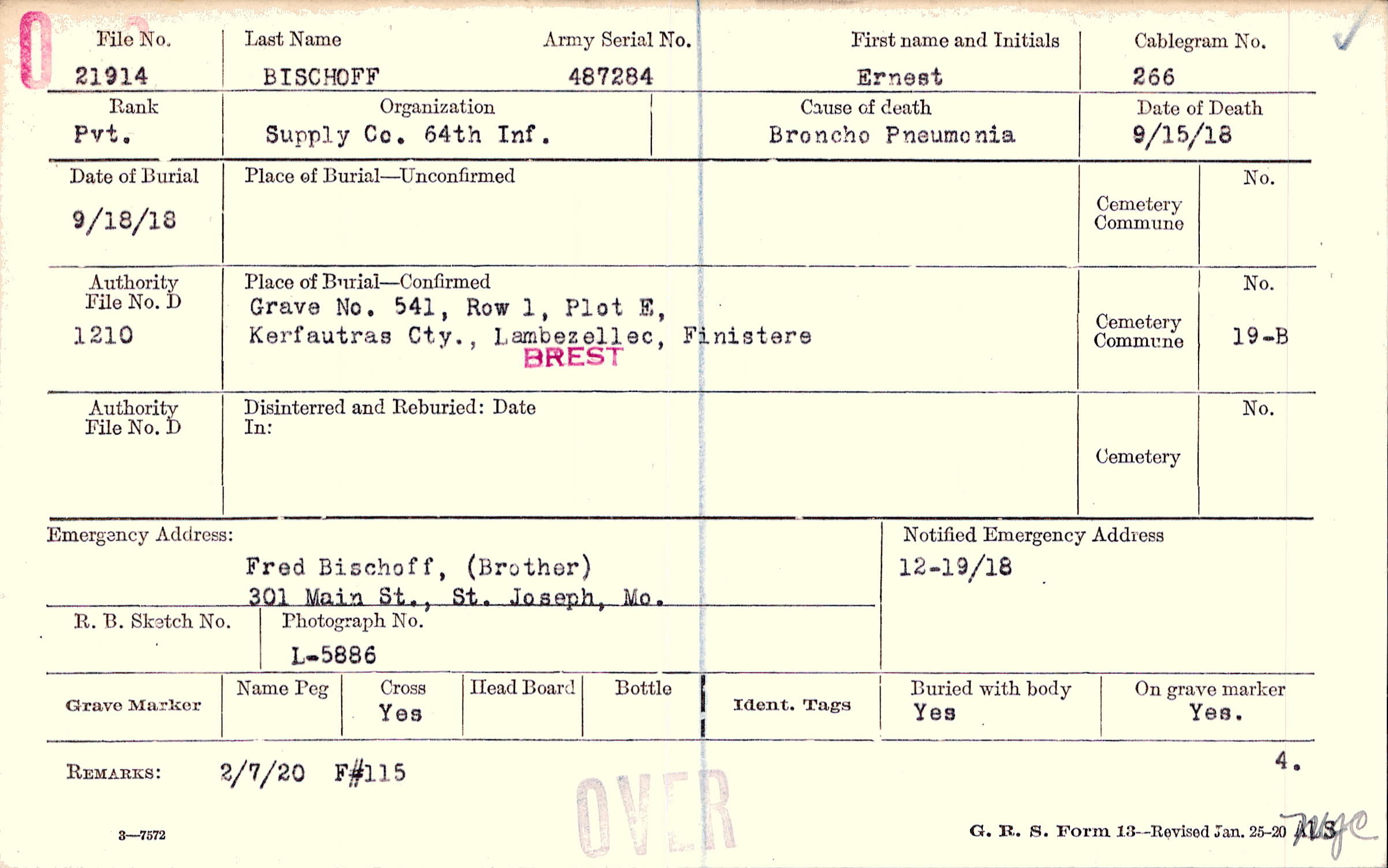 Grave no, 541, Row 1, Plot E, Kerfautras Cty., Lambezellec, Finistere