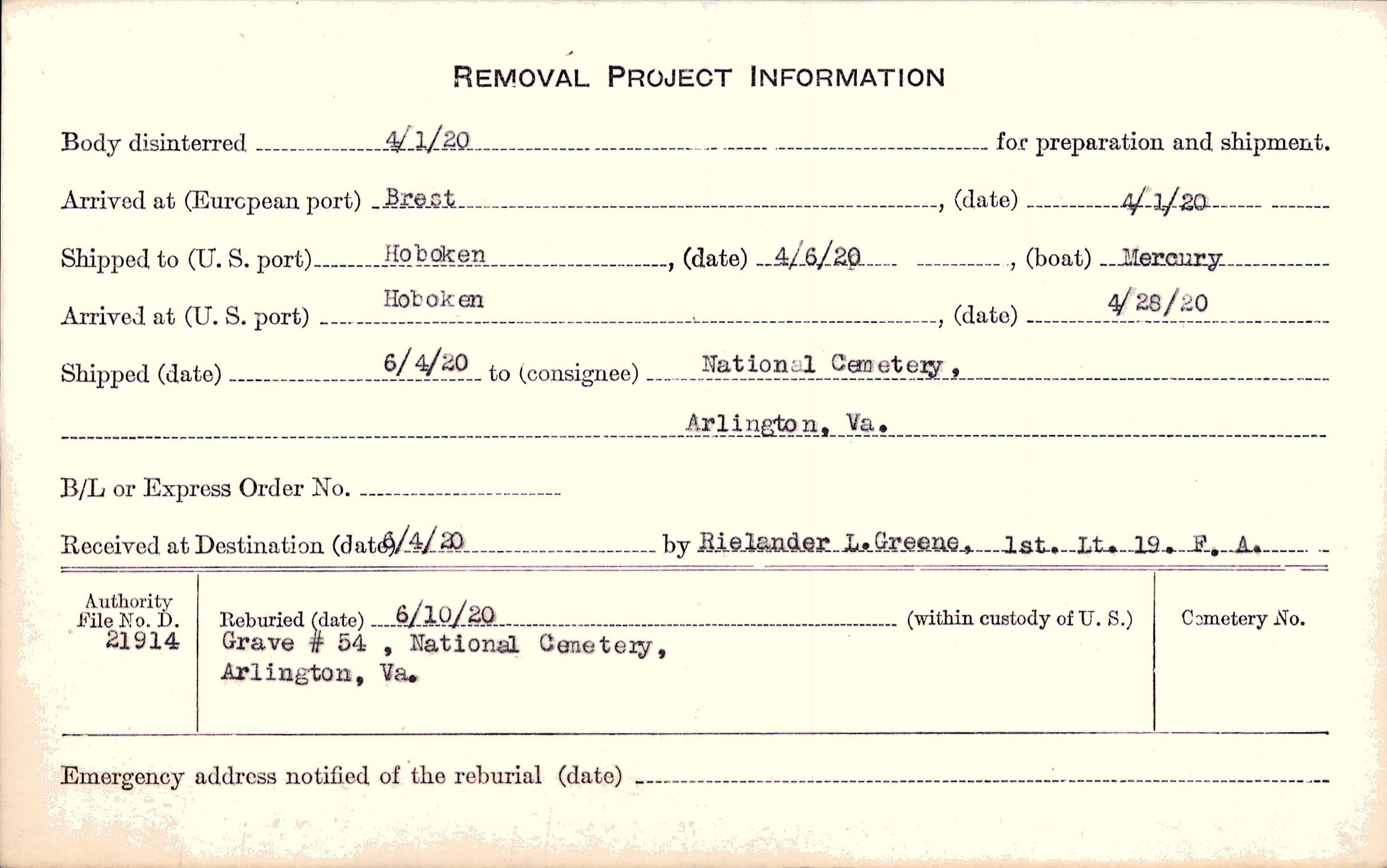 Body disinterred 4/1/1920 for preparation and shipment.