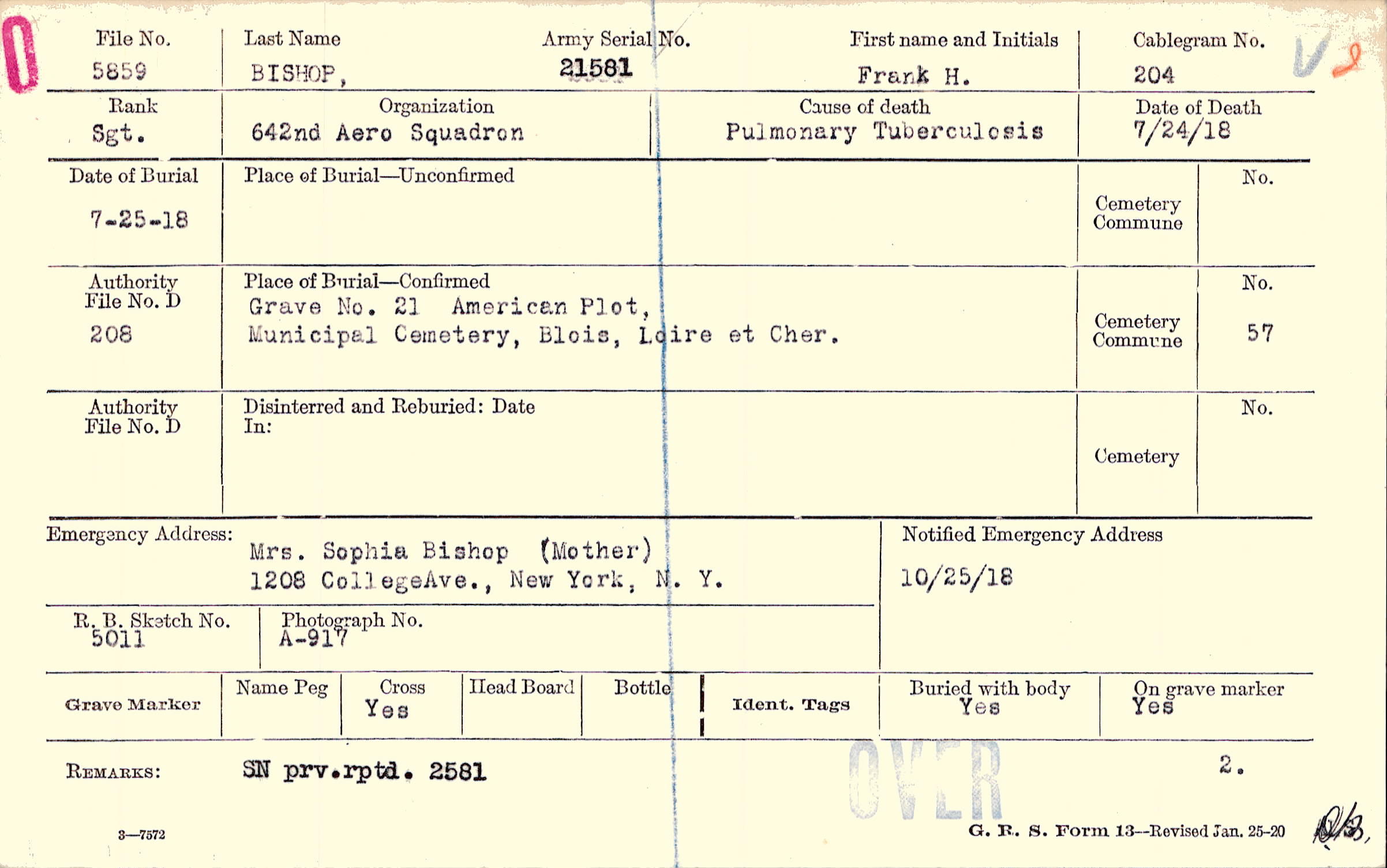 Grave 21, American Plot, Municipal Cemetery, Blois, Loire et Cher.