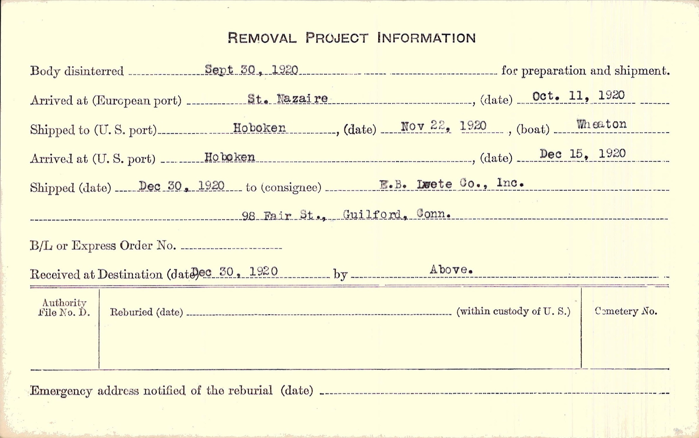 Body disinterred 9/30/1920 for preparation and shipment.