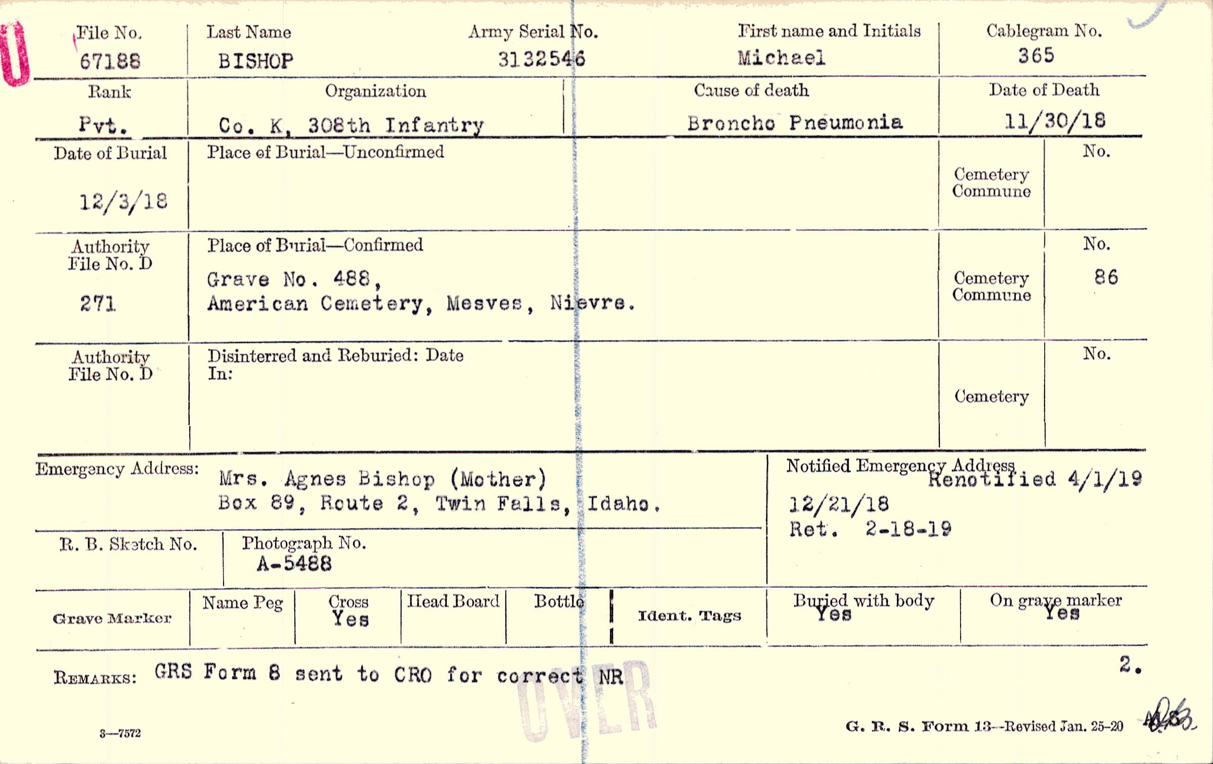 Mrs. Agnes Bishop (Mother), Box 89, Route 2, Twin Falls, Idaho.