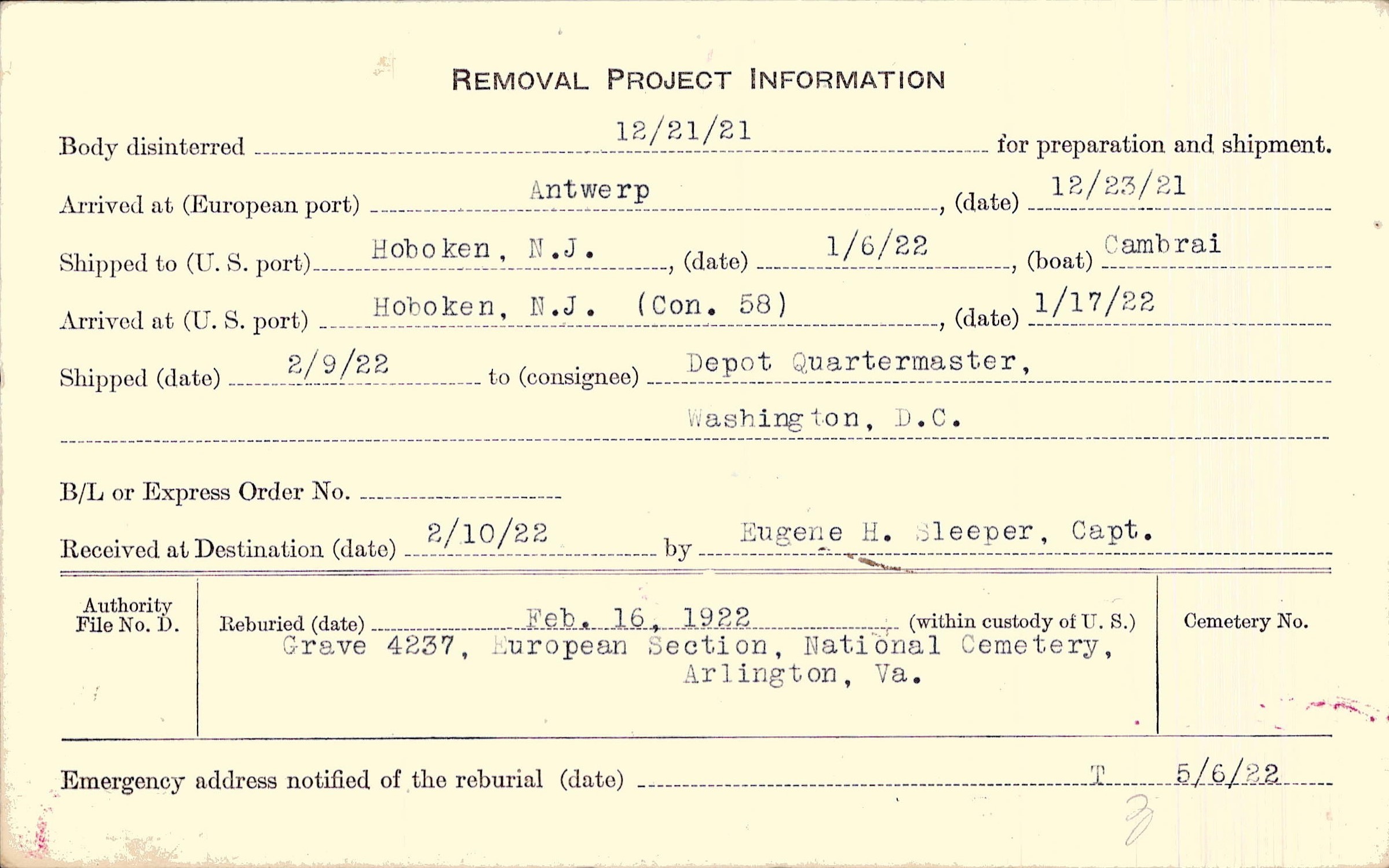 Body disinterred 12/21/1921 for preparation and shipment.